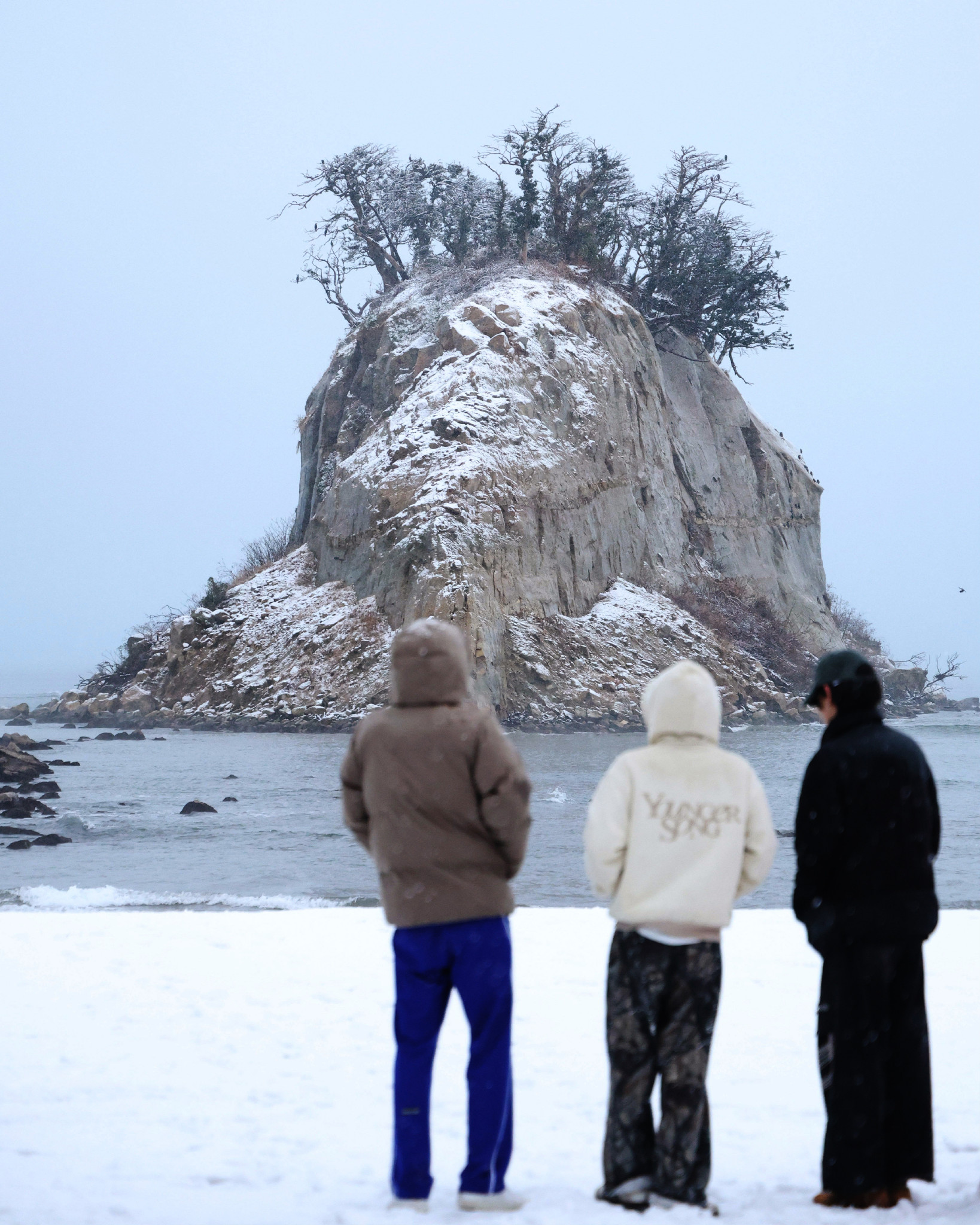 能登半島地震から2年を迎えた1日、山肌が一部崩れた景勝地「見附島」(石川県珠洲市)は雪に覆われた。高校時代の友人3人で金沢市から訪れた蔵本健斗さんは「復旧が一日でも早く進んでほしい」と願いを込めた。