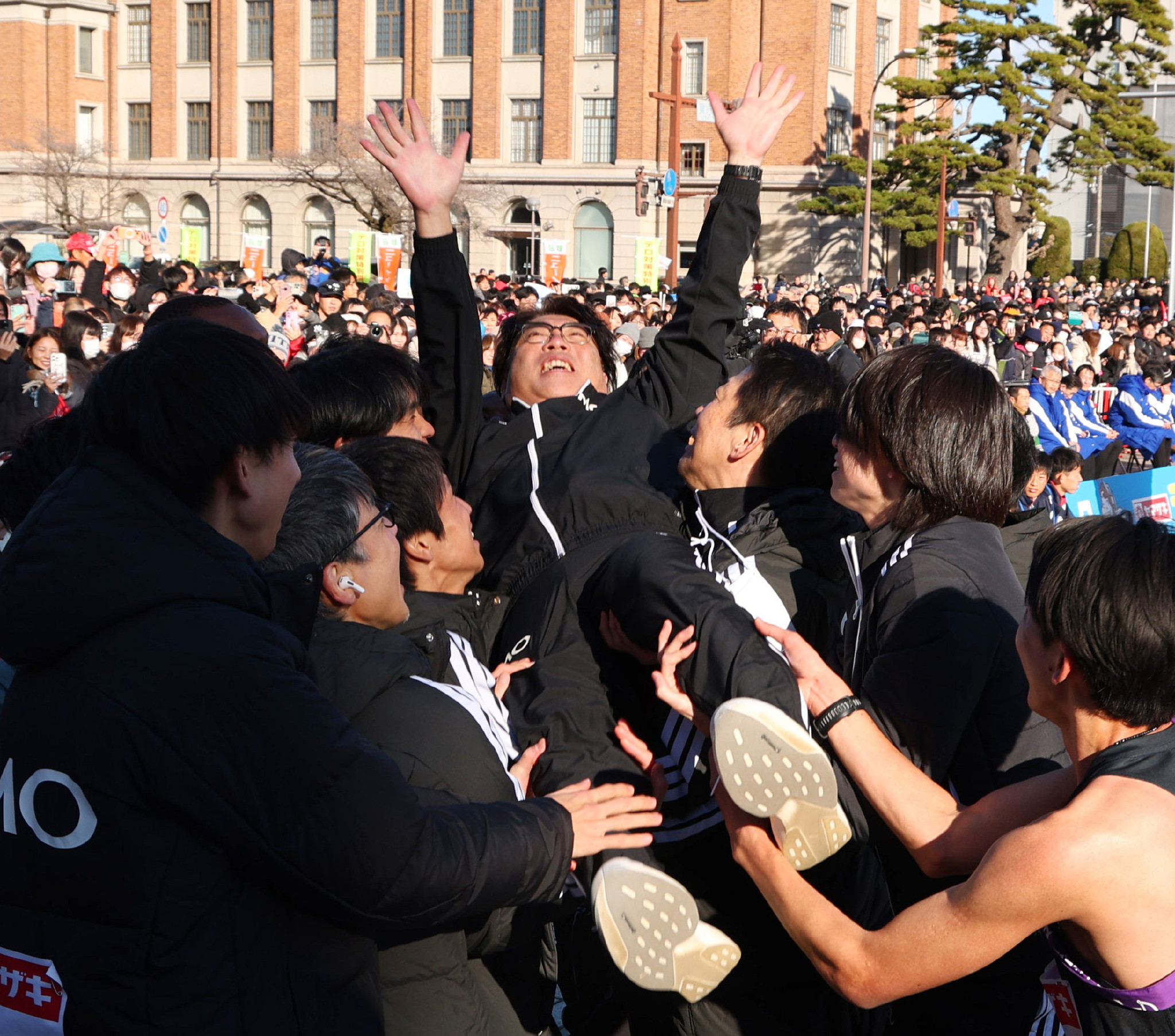 全日本実業団駅伝。初優勝し、胴上げされるGMOインターネットグループの伊藤公一監督(中央)=1日、前橋市