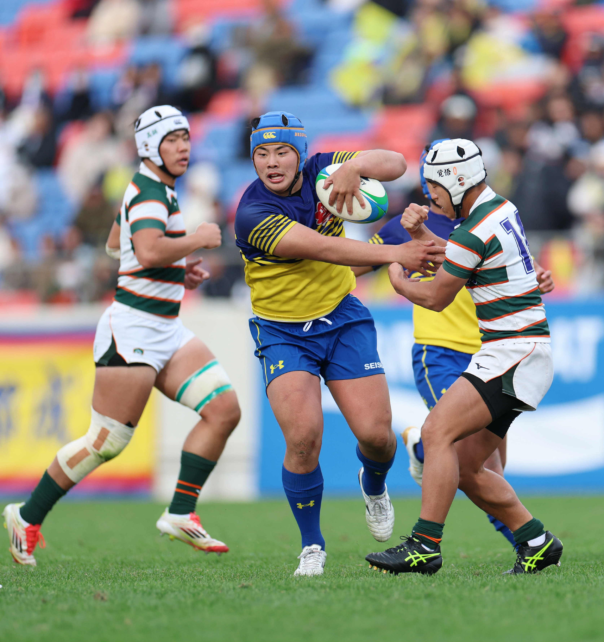 京都成章―高鍋。後半、突進する京都成章の土肥(中央)=1日、大阪・花園ラグビー場
