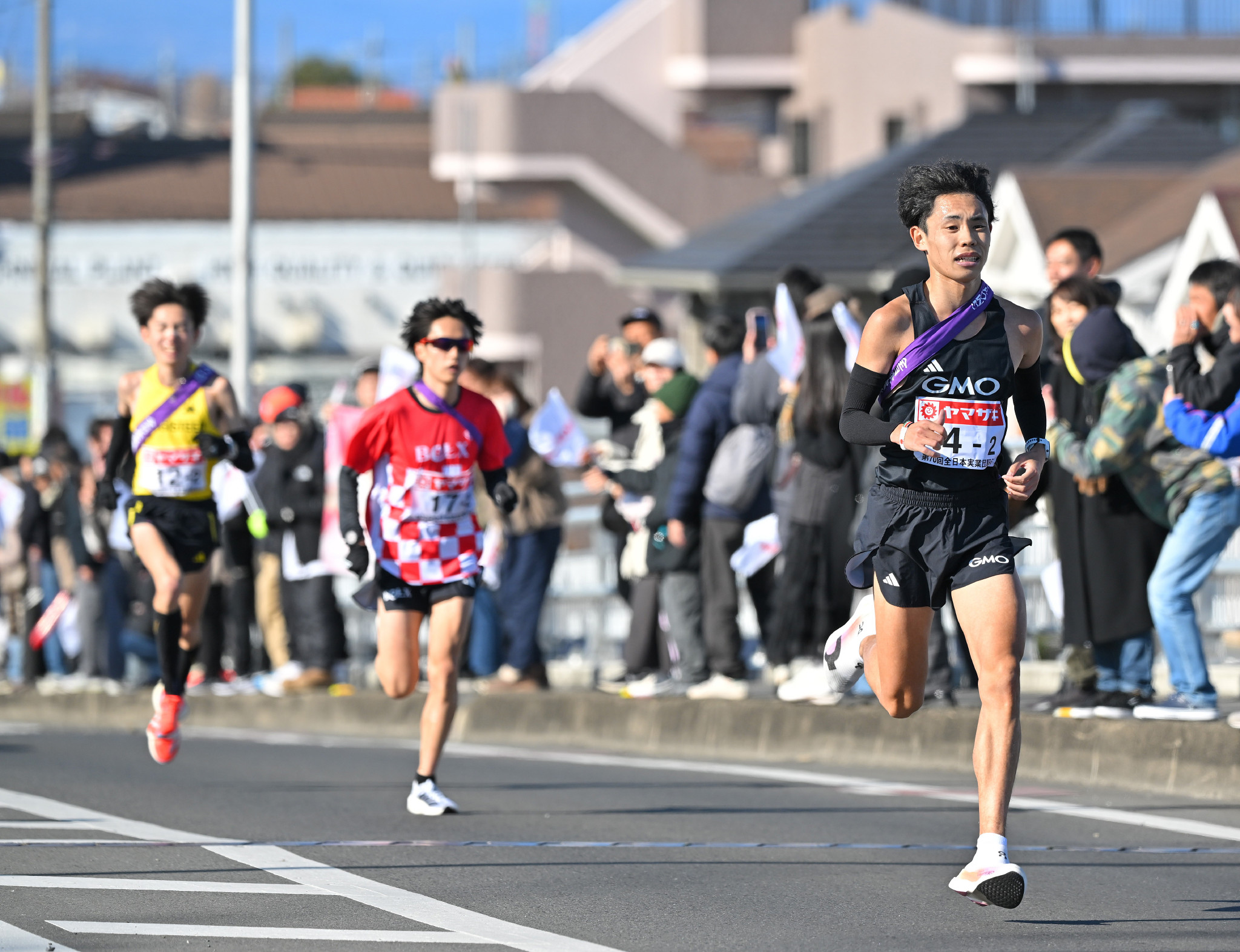 2区で先頭に出るGMOインターネットグループの今江勇人(右)=1日、群馬県内(代表撮影)