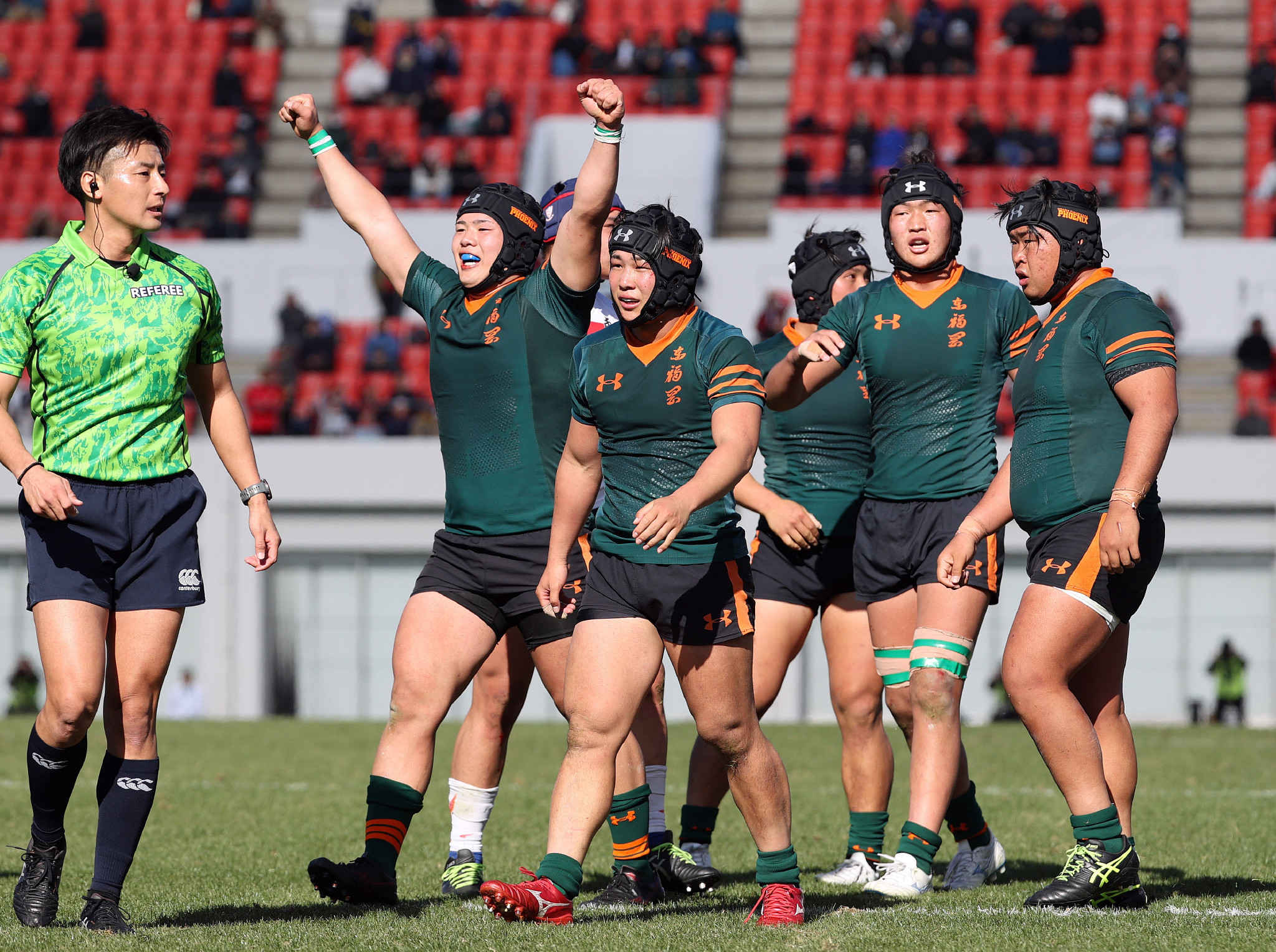第105回全国高校ラグビー大会。東福岡(福岡第1)は、初の4強を狙った東海大相模(神奈川第2)に21―17で逆転勝ち。写真は喜ぶ東福岡の選手=3日、大阪・花園ラグビー場