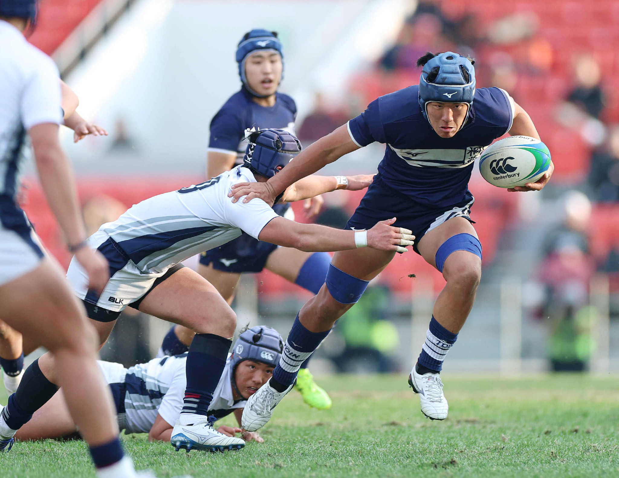 大阪桐蔭―桐蔭学園。後半、突進する桐蔭学園の足立(右)=5日、大阪・花園ラグビー場