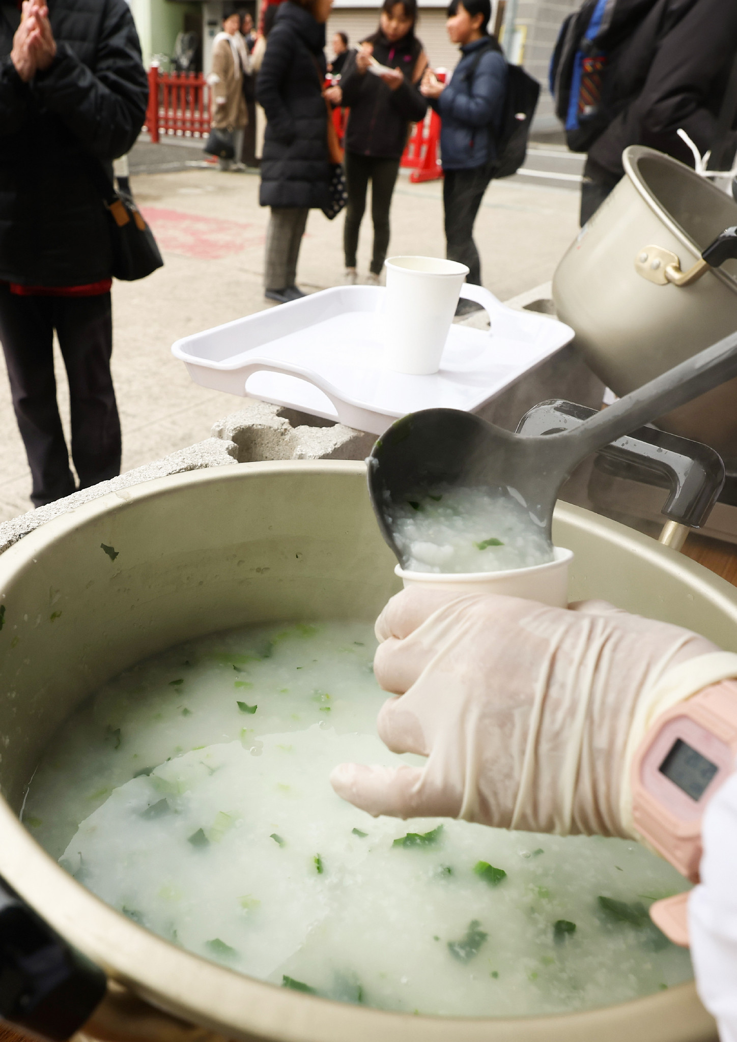 東京都台東区の鷲(おおとり)神社で7日、七草がゆが振る舞われた。一年間の無病息災を願い、約1000食が用意された。都心の最高気温が6.4度と冷え込む中、厚手の上着を着込んだ参拝客らが体を温めた。
