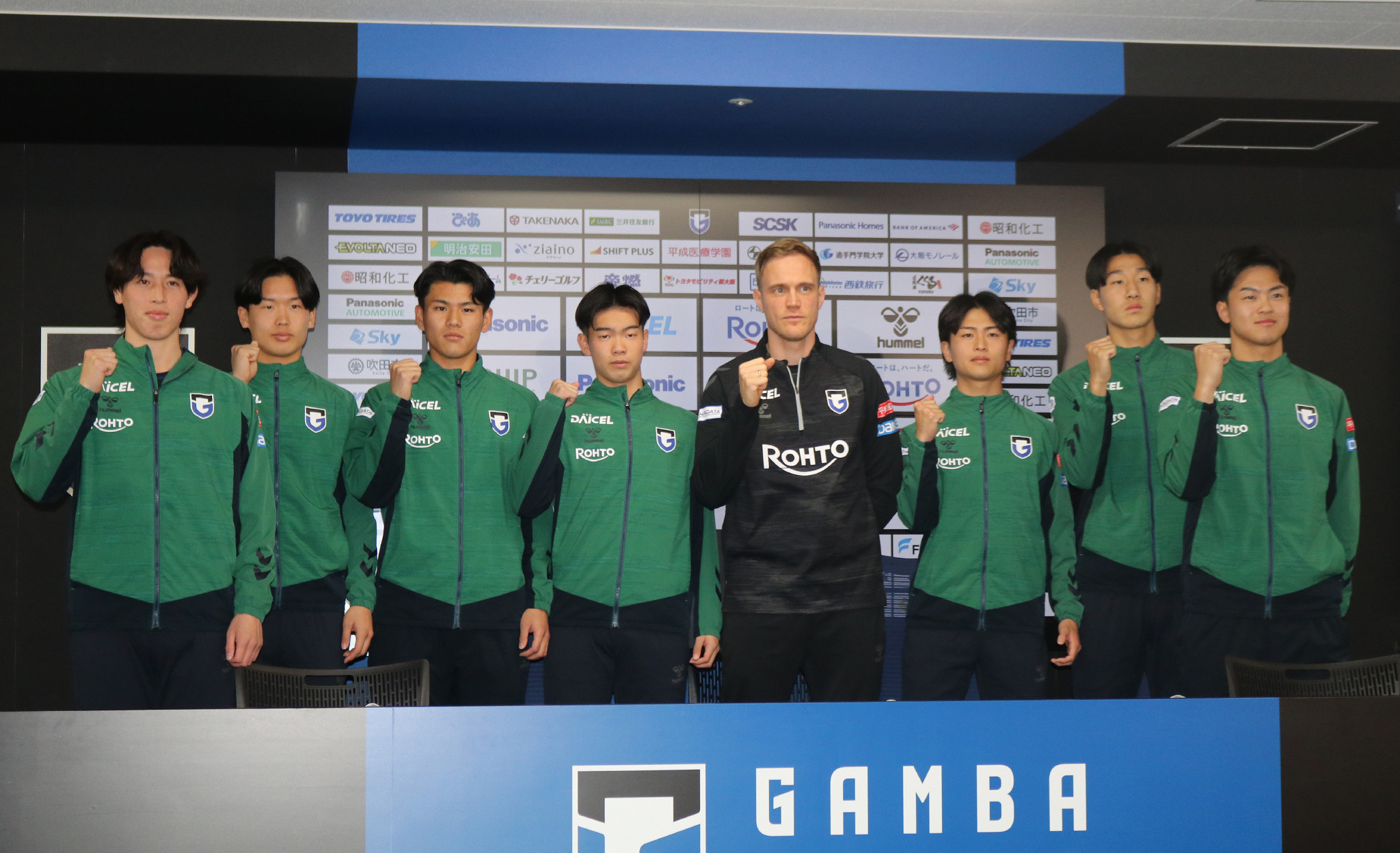 新体制発表会見で撮影に応じるG大阪のウィッシング新監督(中央右)と選手ら=7日、大阪府吹田市