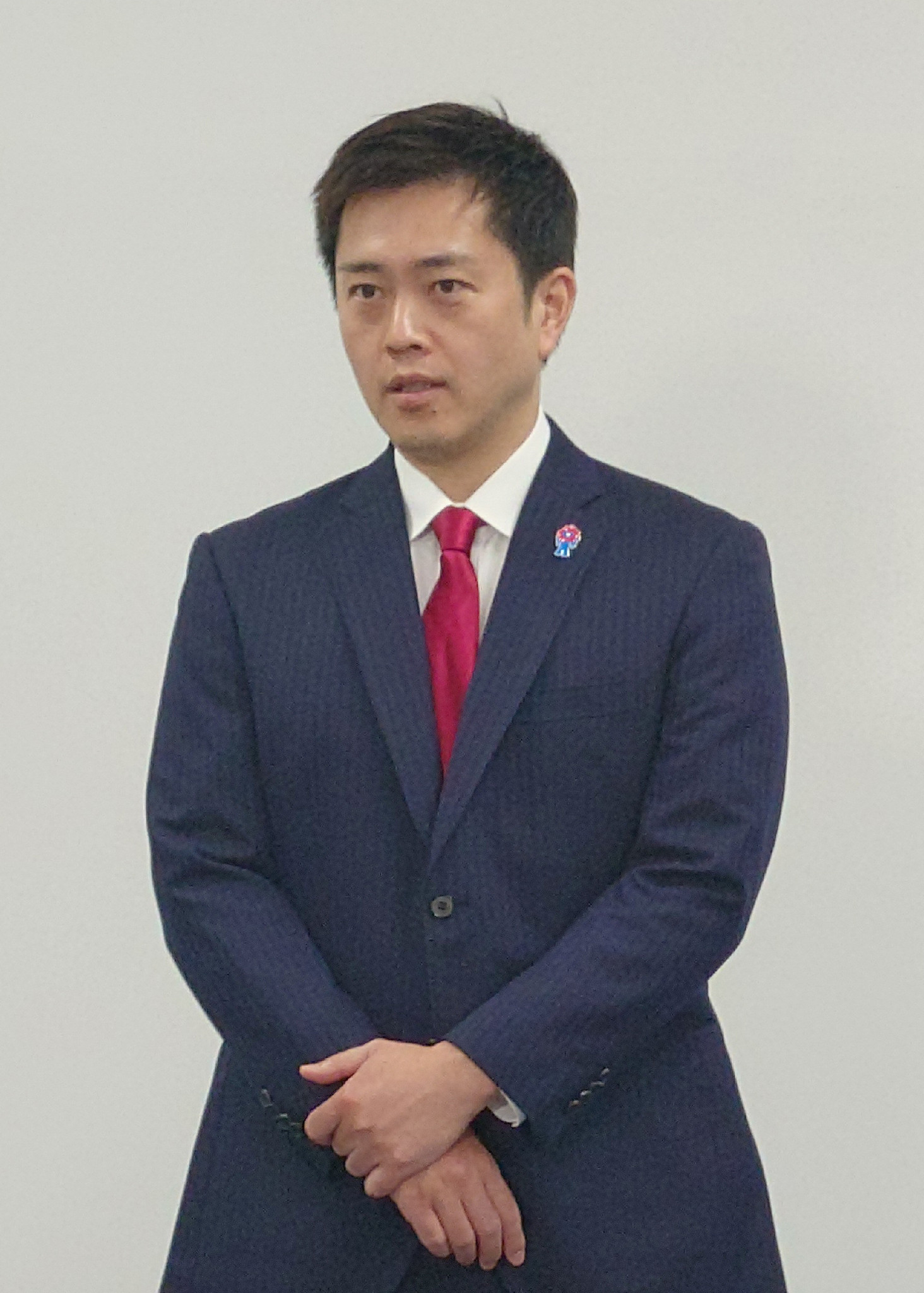 記者団の質問に答える日本維新の会の吉村洋文代表=7日午後、大阪市中央区