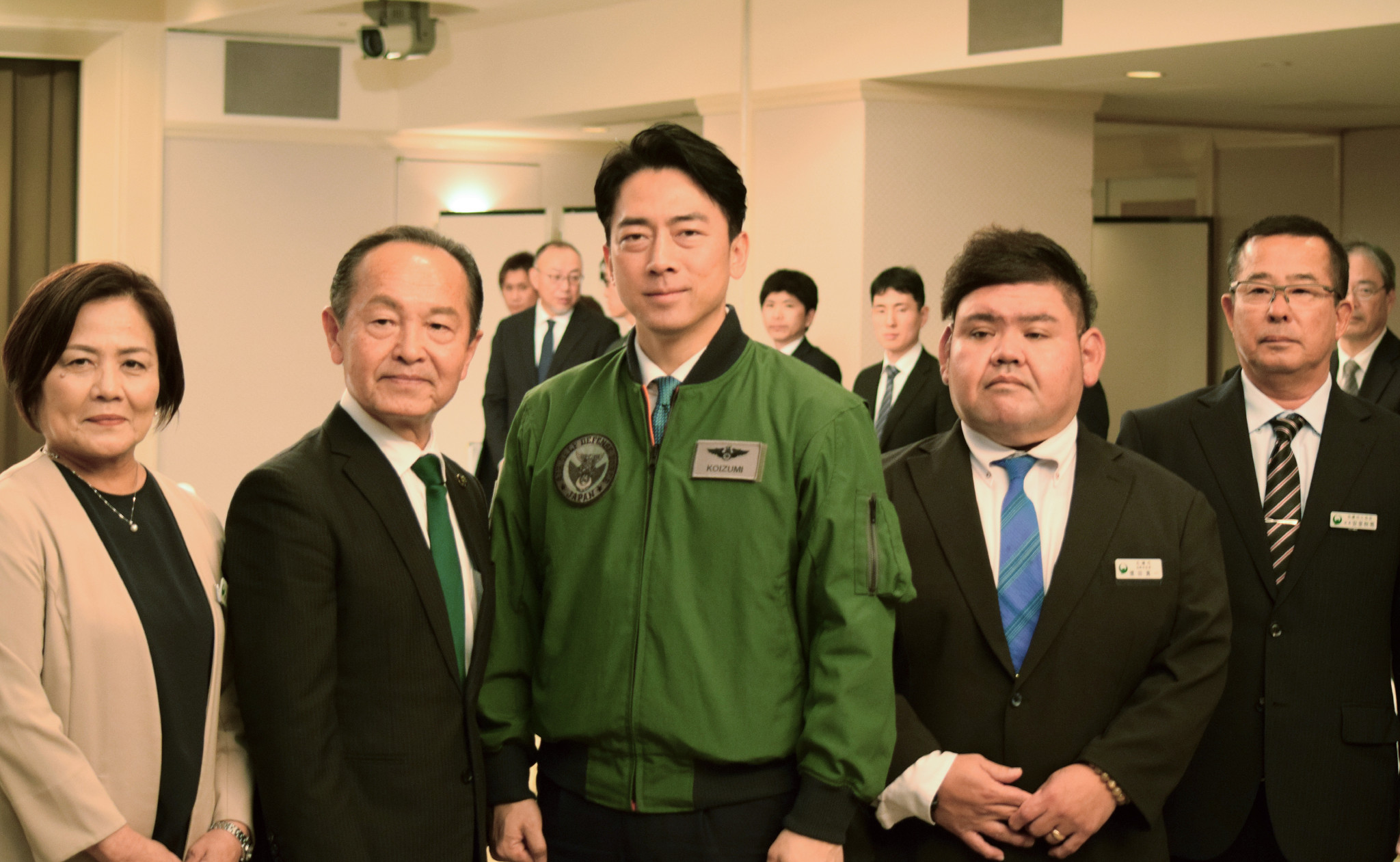 会談を前に写真に納まる小泉進次郎防衛相(中央)と渡具知武豊沖縄県名護市長(左から2人目)ら=7日午後、那覇市