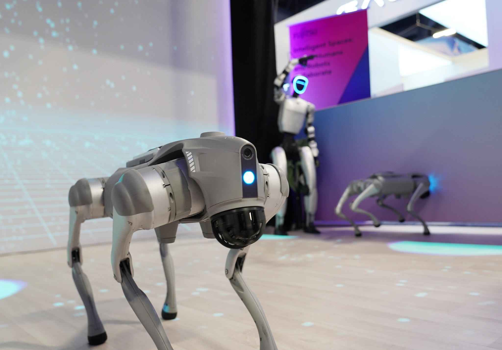 家電・IT見本市「CES」に出展した、富士通のロボット同士を協調させて動かす「フィジカルAI(人工知能)」の技術。ロボは社外製品を使っている=7日、米ラスベガス