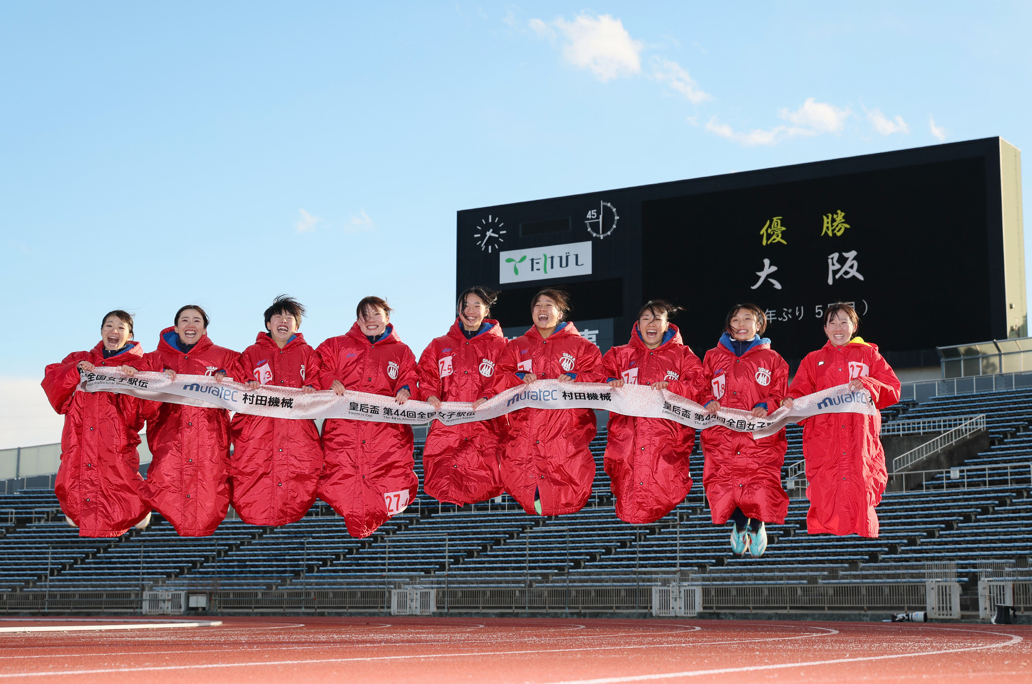 都道府県女子駅伝。3年ぶり5度目の優勝を果たし、記念撮影する大阪の選手たち=11日、たけびしスタジアム京都