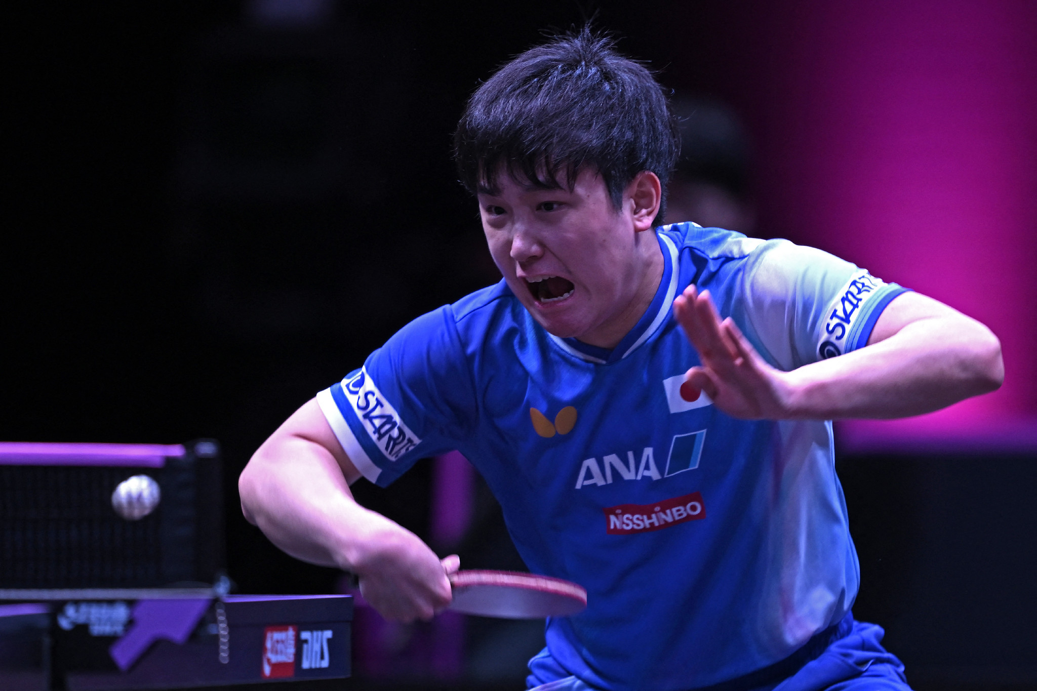 卓球のワールドテーブルテニス(WTT)チャンピオンズ・ドーハ大会。男子シングルス準決勝でプレーする張本智和。3―4で競り負けた=11日、ドーハ