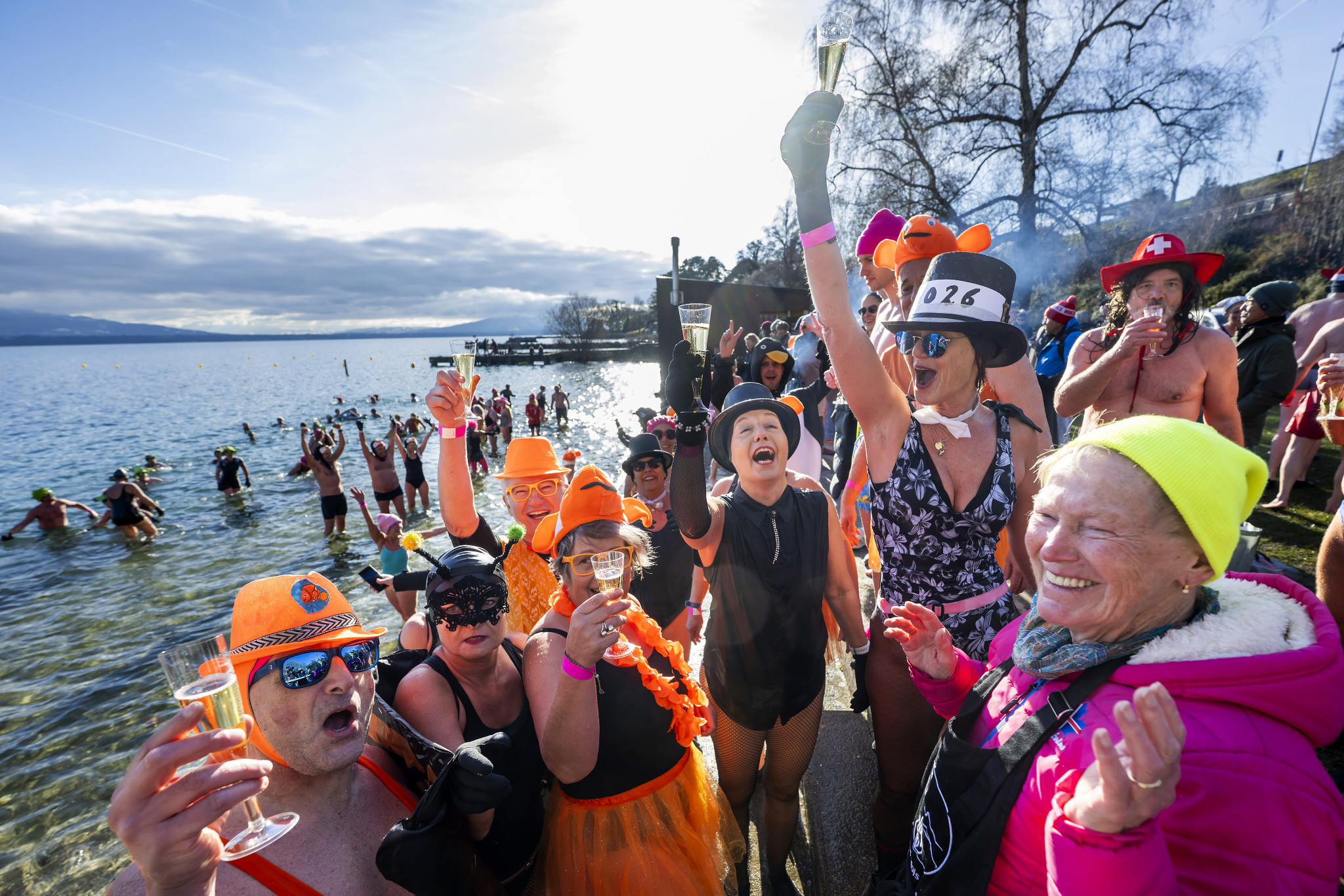 11日、スイス西部ニヨンのレマン湖畔で、ワイングラスを片手に水着姿で歓声を上げる人々。いてつく寒さのこの時期に湖を泳ぐ人々をたたえる恒例行事が今年も開かれた。【EPA時事】