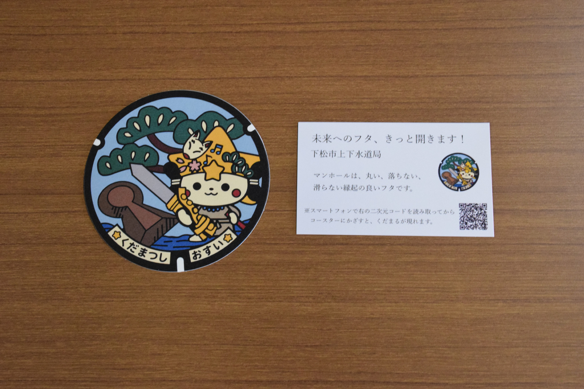山口県下松市は、受験生の合格祈願と上下水道事業のPRを目的に、マンホールのふたのデザインを使ったコースターを700枚作成し、無料配布している=13日午後、山口県下松市