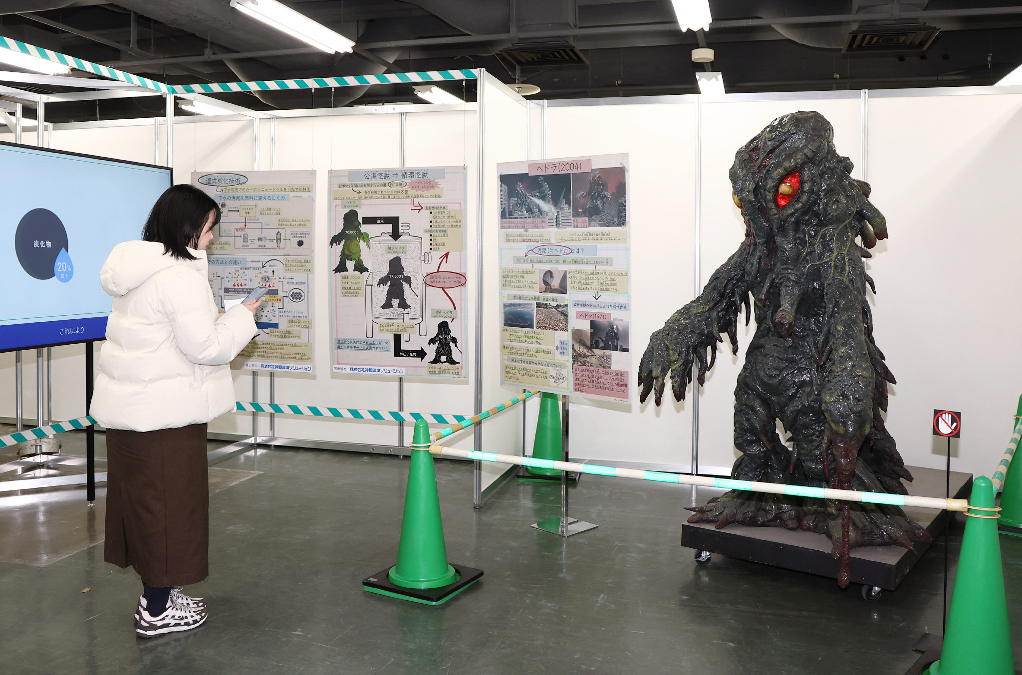 1954年に誕生した映画「ゴジラ」を通じ、防災・減災について学ぶ特別企画展「ゴジラサイエンス展」で、安心・安全な社会を目指す科学技術の役割について説明するパネル=14日午後、東京都千代田区の科学技術館
