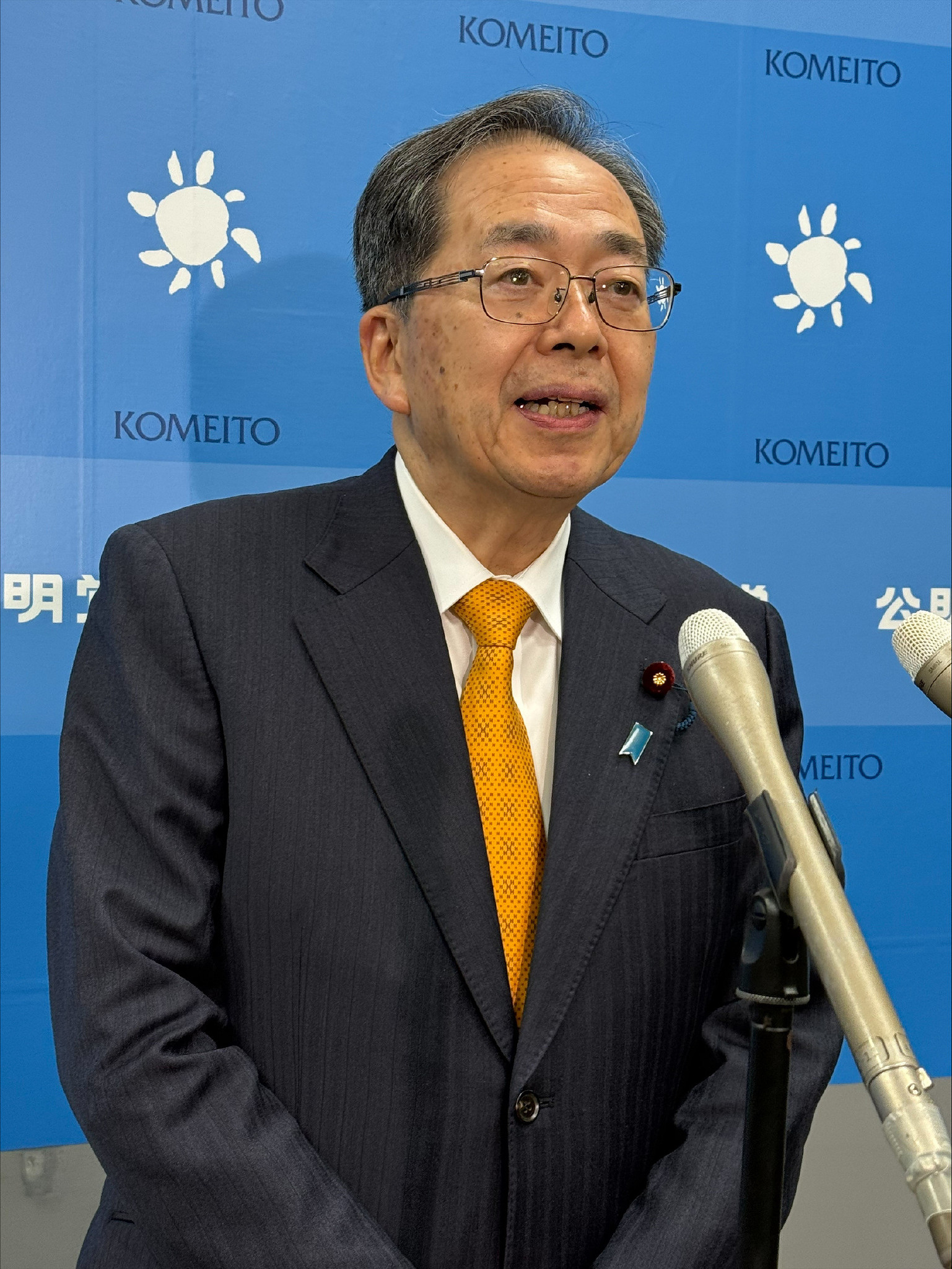 記者団の取材に応じる公明党の斉藤鉄夫代表=14日午後、東京都新宿区