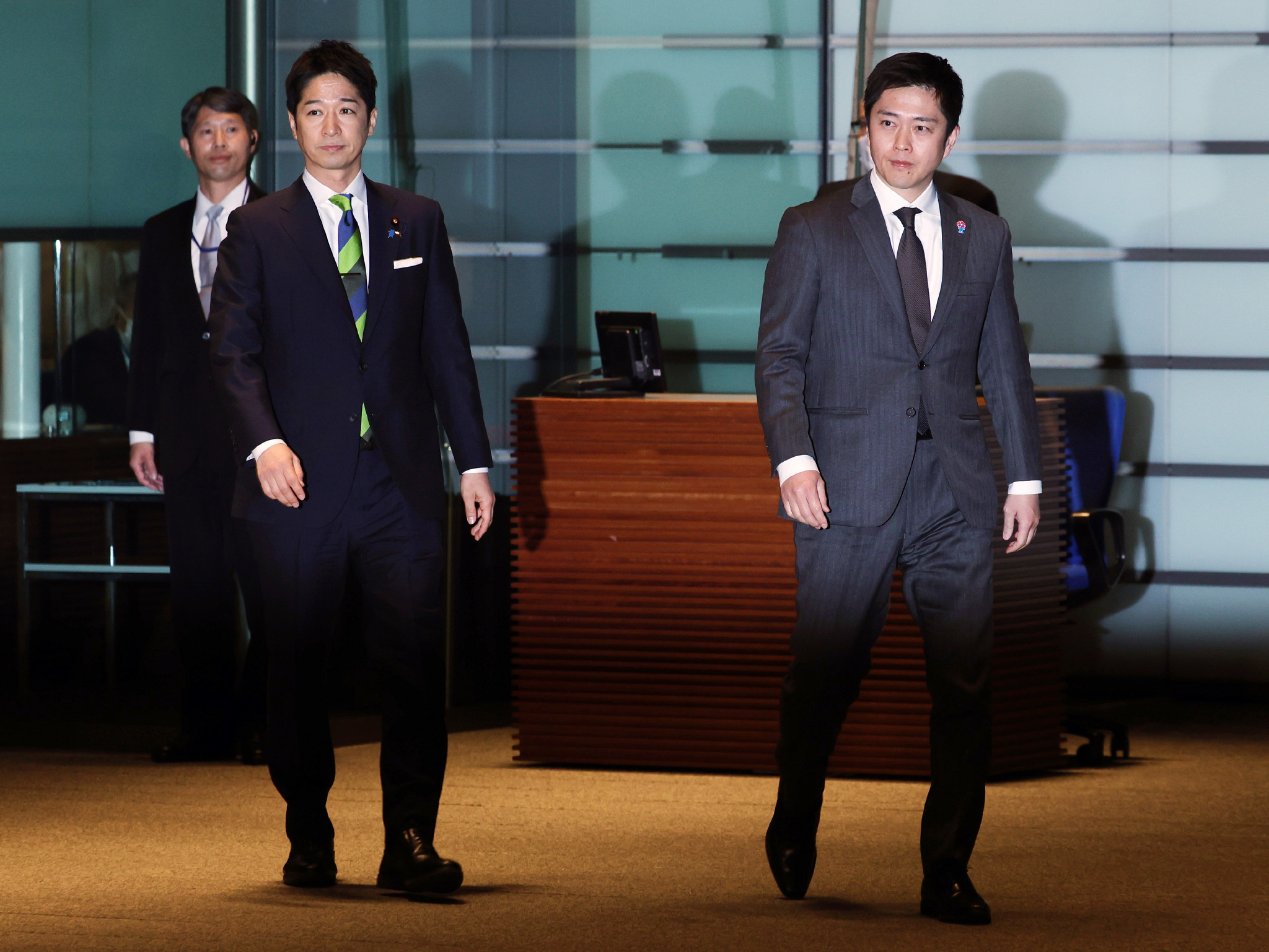 首相官邸の総理執務室に向かう日本維新の会の吉村洋文代表(右)と藤田文武共同代表=14日午後、東京・永田町