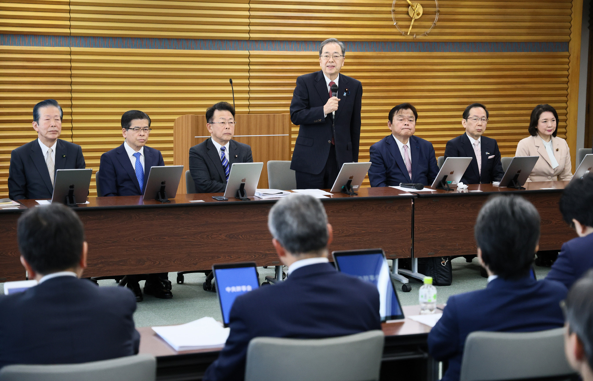公明党の中央幹事会で発言する斉藤鉄夫代表(中央)=15日午前、東京都新宿区