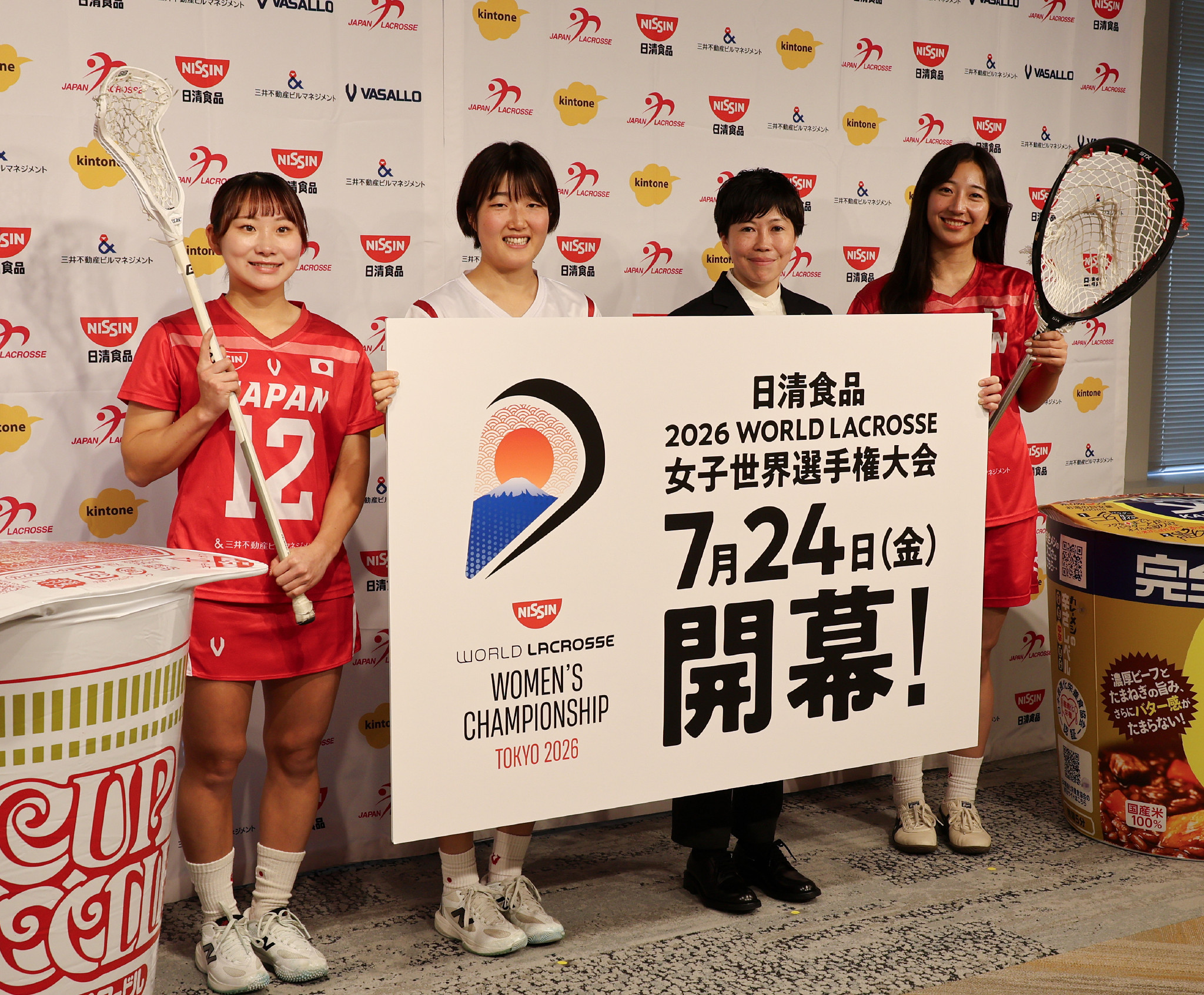 日本ラクロス協会は15日、7月に東京で開幕する女子世界選手権の概要や代表チームの取り組みを発表した。写真は、ラクロス女子の藤田瑠奈(右端)、宮沢明日香ヘッドコーチ(右から2人目)ら。