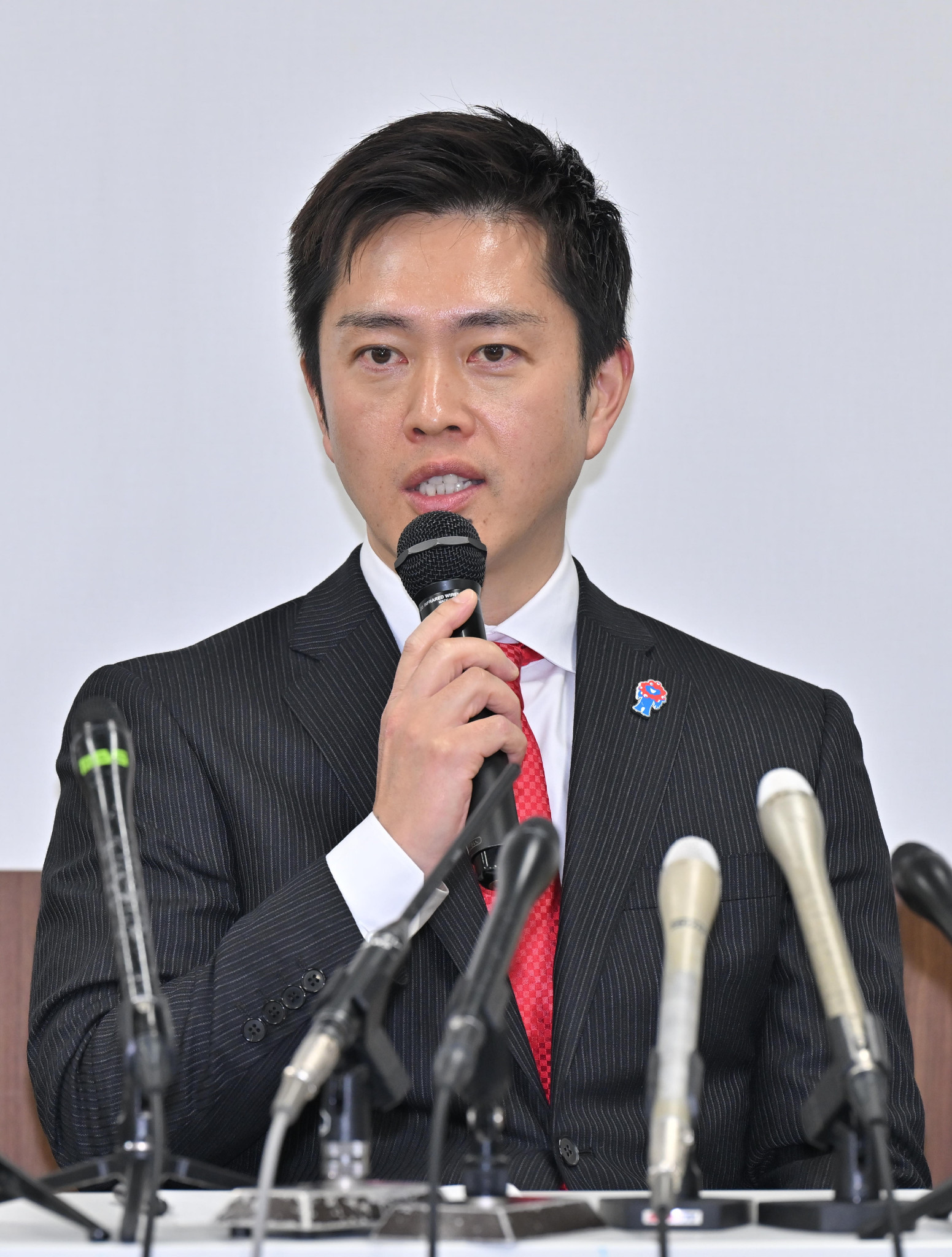 記者会見で質問に答える大阪府の吉村洋文知事=15日午後、大阪市中央区