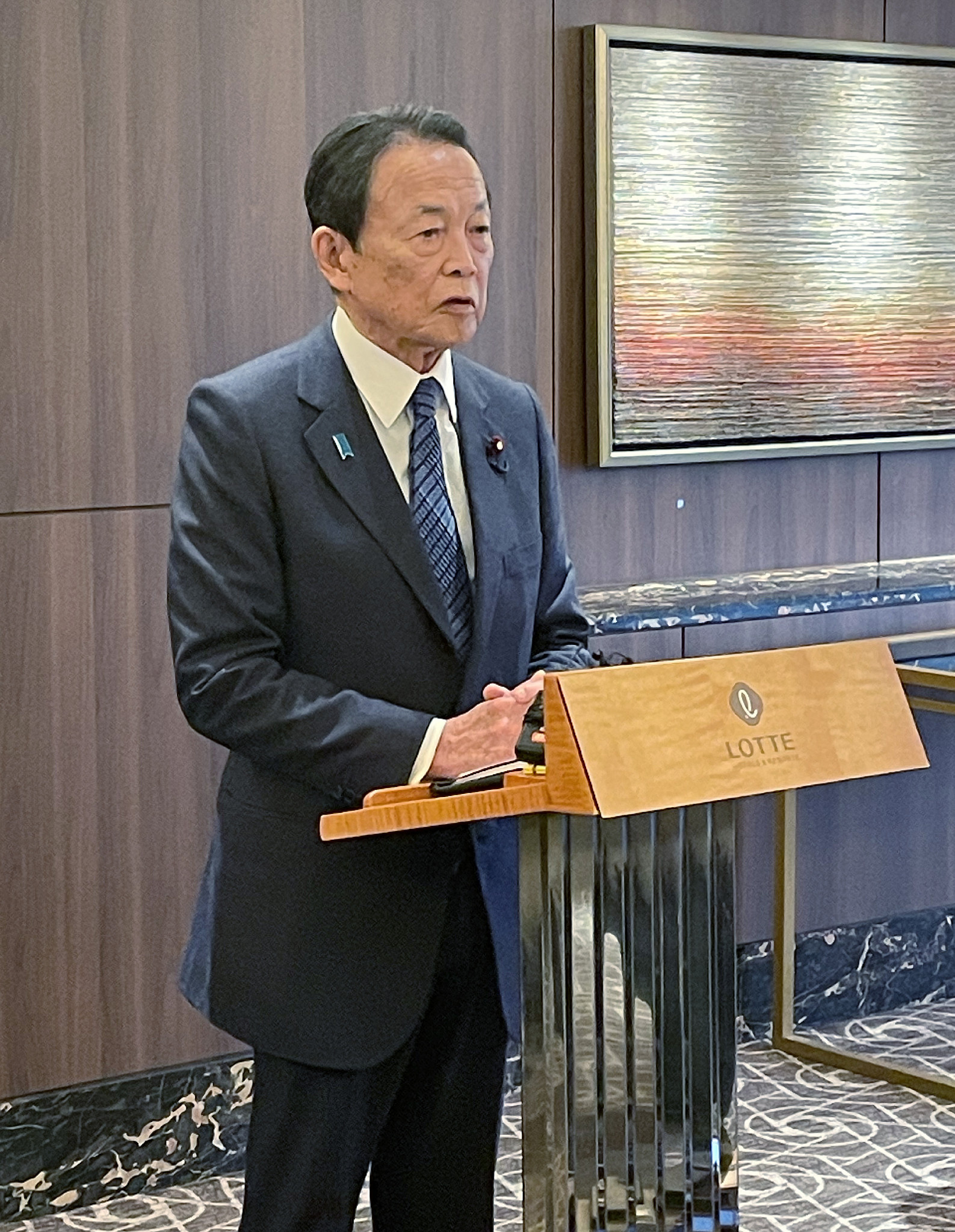 16日、ソウルで記者団の取材に応じる自民党の麻生太郎副総裁。