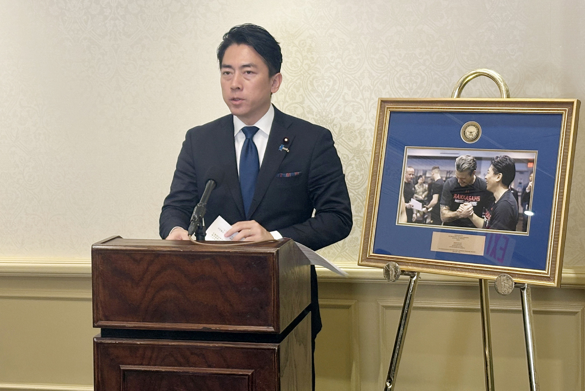 日米防衛相会談を終え、記者団の取材に応じる小泉進次郎防衛相=15日、ワシントン
