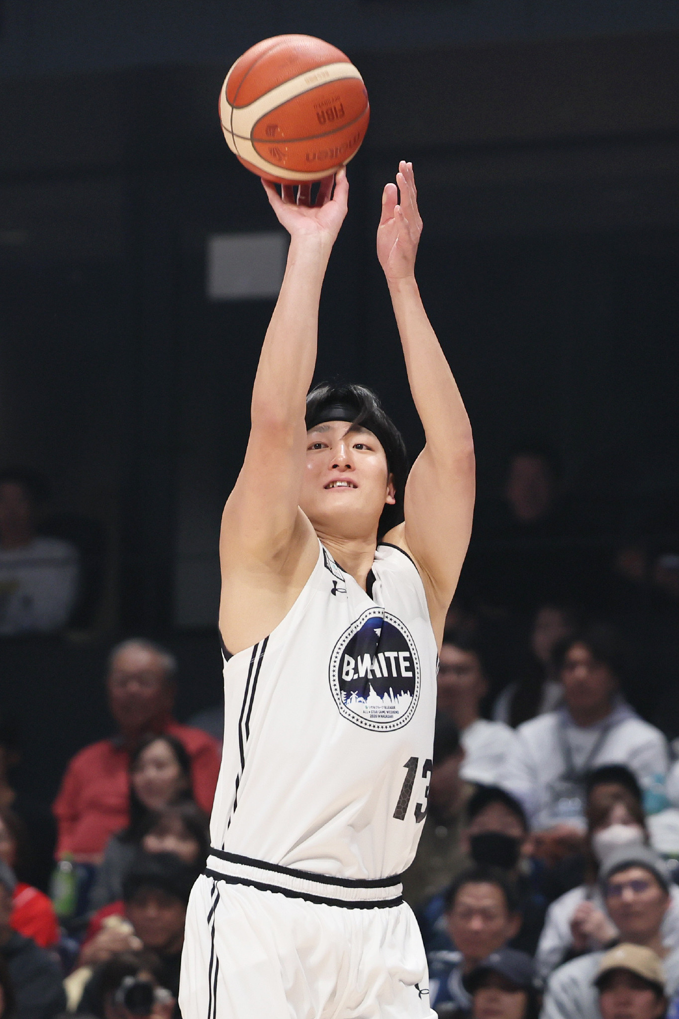 Bリーグオールスター。第2クオーター、3点シュートを決めるBホワイトの田中=18日、長崎・ハピネスアリーナ