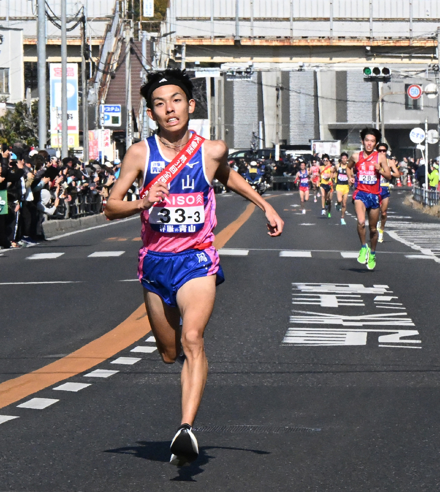 都道府県男子駅伝。3区を走る岡山の黒田朝日=18日、広島県廿日市市