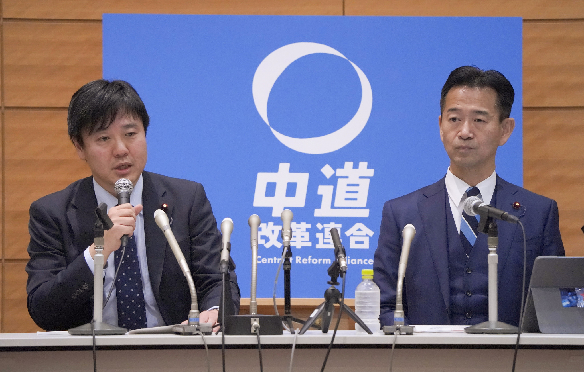新党「中道改革連合」の基本政策について、記者会見する立憲民主党の本庄知史政調会長(左)と公明党の岡本三成政調会長。安全保障関連法について「存立危機事態での自衛権行使は合憲」と明記=19日午後、国会内