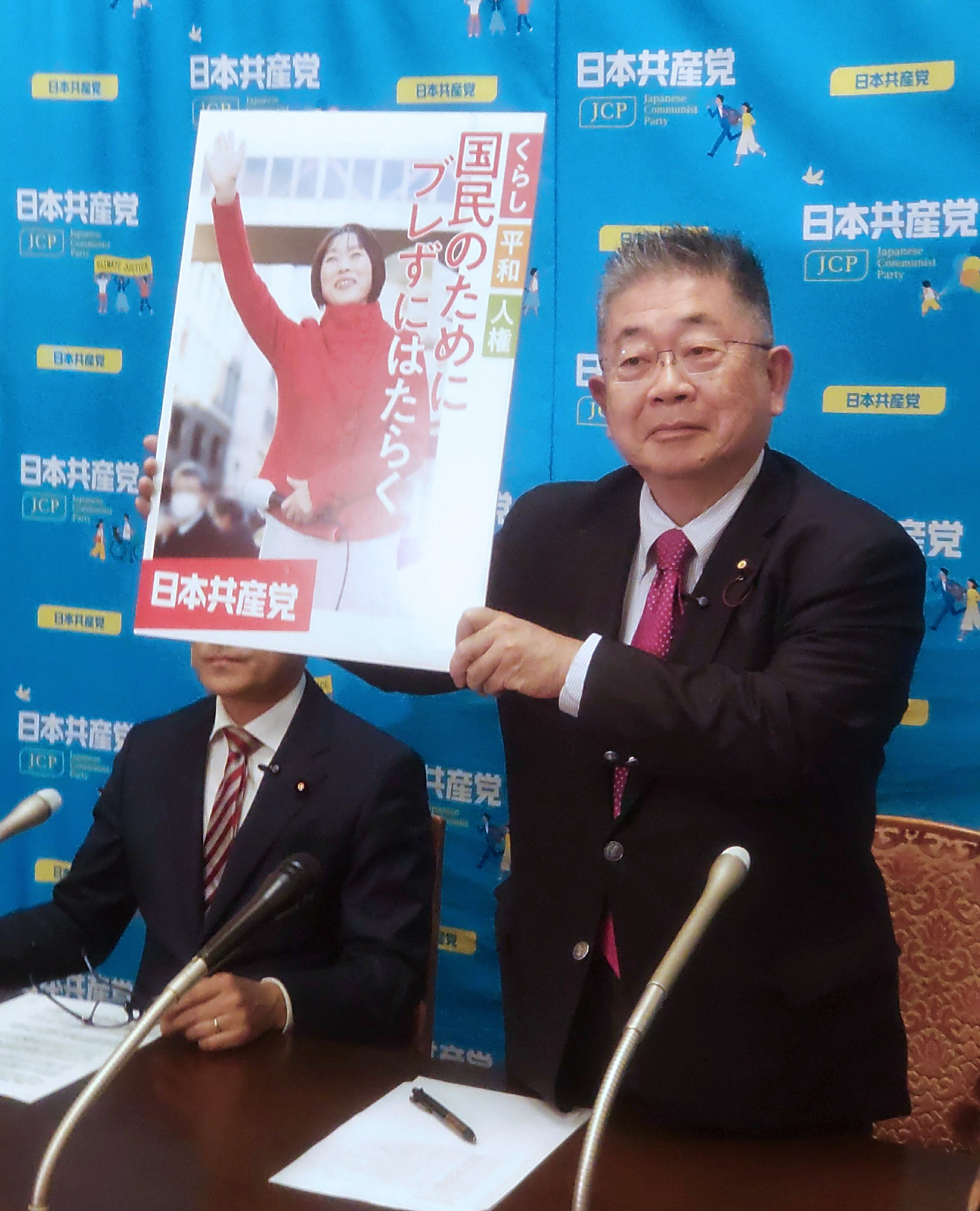 記者会見で次期衆院選のポスターを掲げる共産党の小池晃書記局長=20日午後、国会内