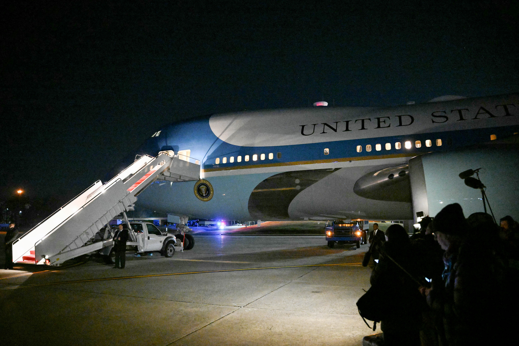 20日、米ワシントン近郊のアンドルーズ空軍基地に引き返した大統領専用機。