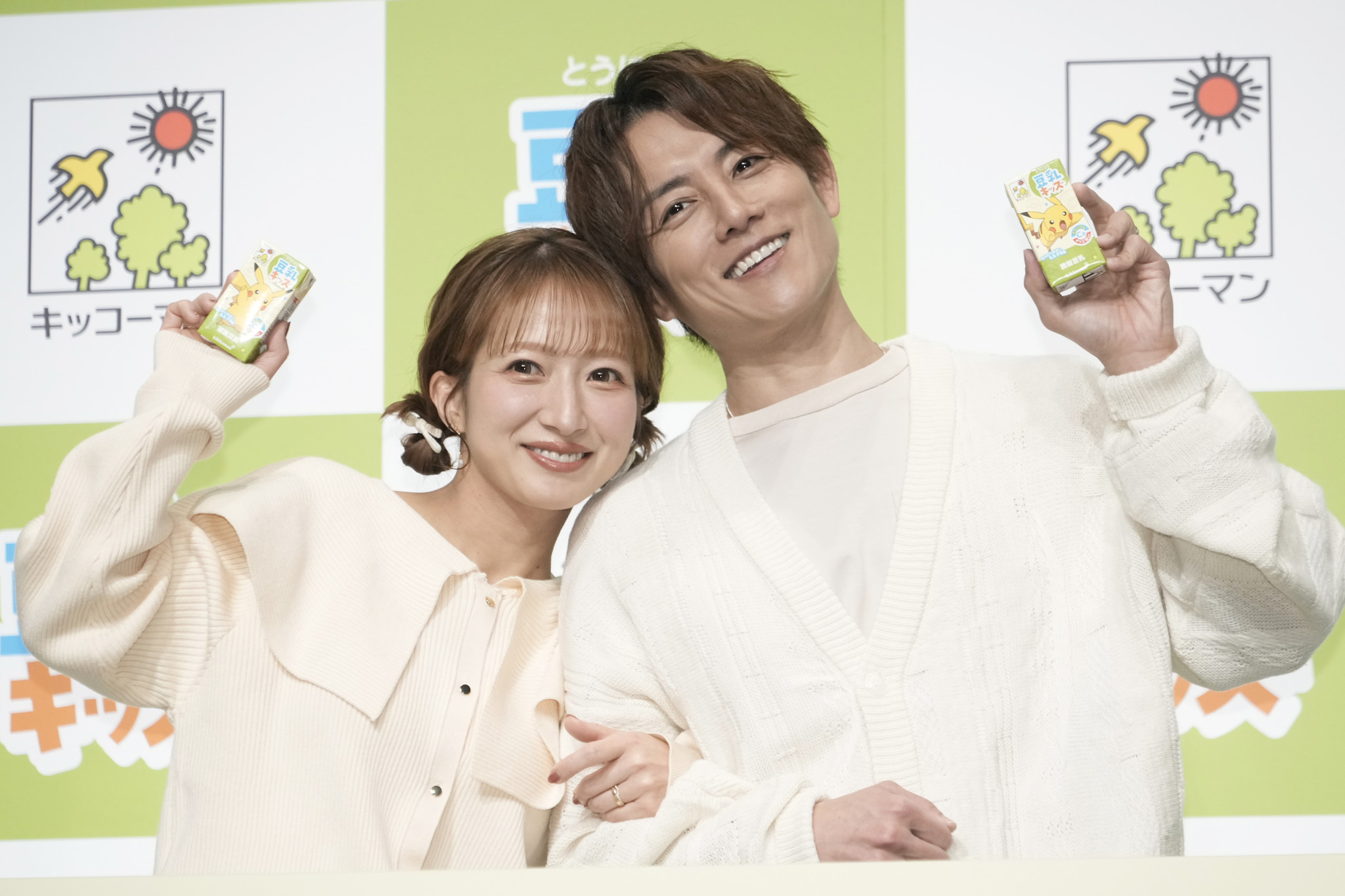キッコーマンが新発売する子ども向け豆乳「豆乳キッズ」発表会に杉浦太陽さんと辻希美さんが夫婦で登壇。子育てで変わらず続けているのは「愛し合うこと」と話す杉浦さんに、辻さんは「恥ずかしいよ!」=21日【時事通信フォト】