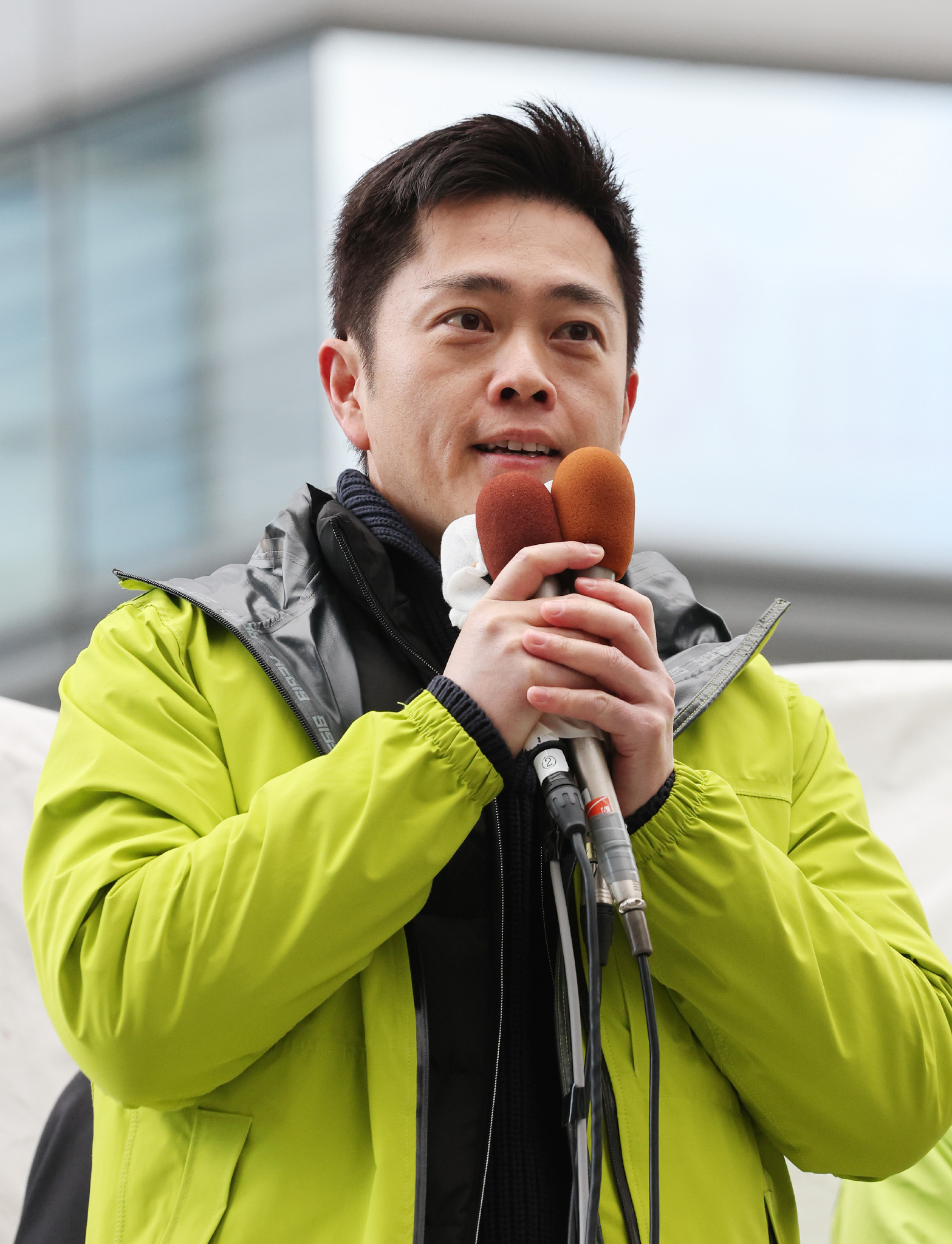 第一声を上げる吉村前知事