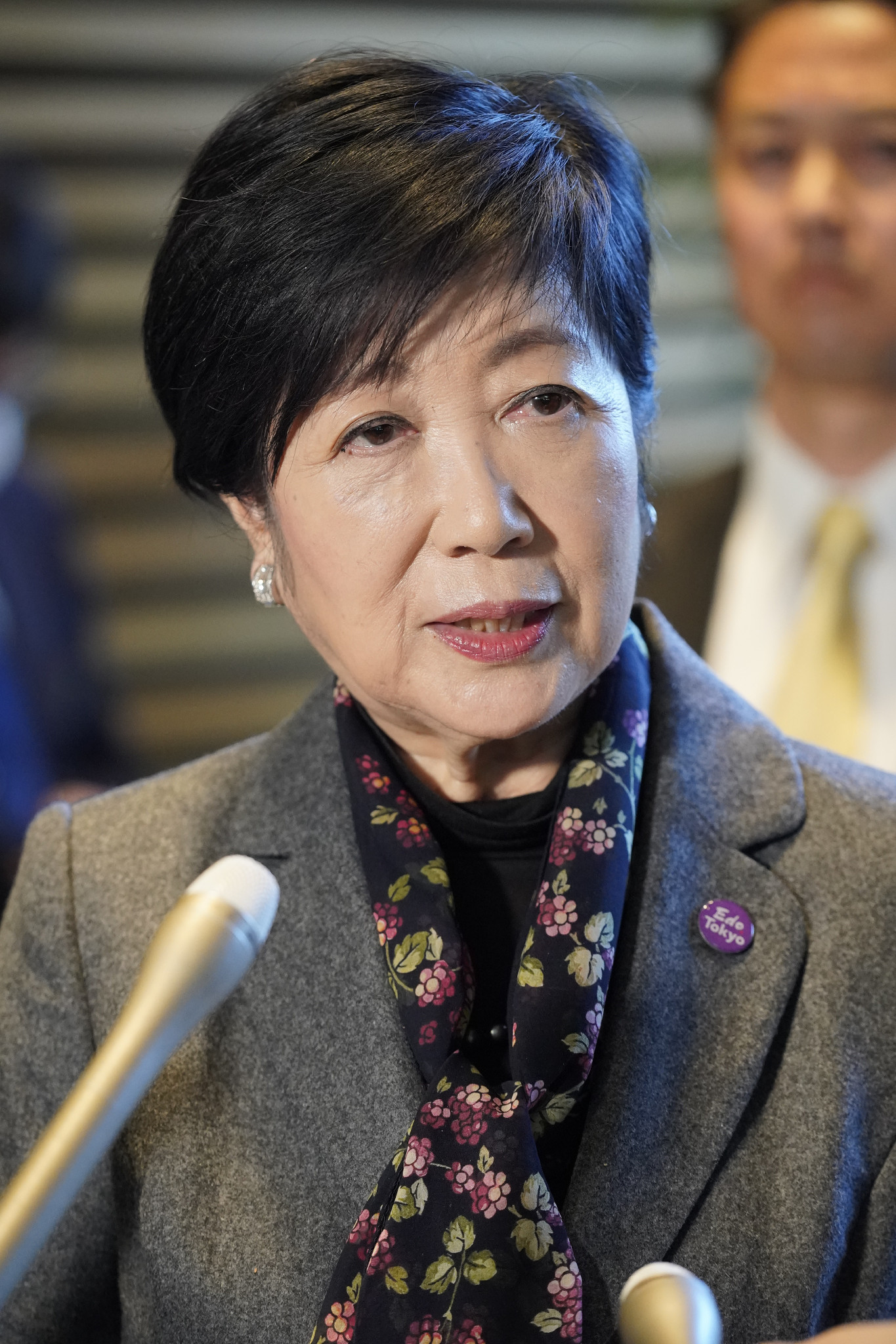 高市早苗首相との会談後、記者団の取材に応じる東京都の小池百合子知事=22日午後、首相官邸