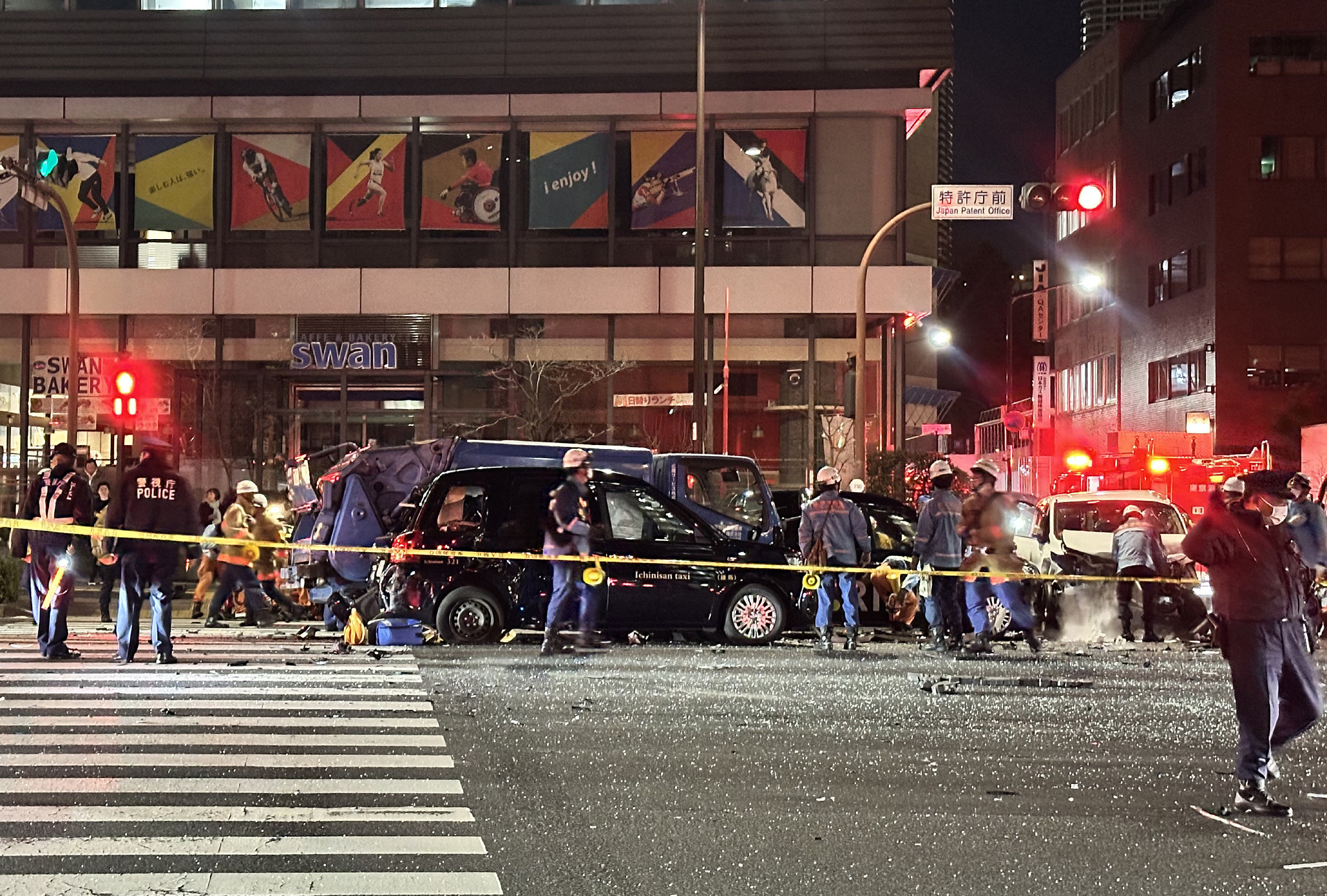 22日午後6時半ごろ、東京都港区赤坂の特許庁前の交差点で6台が絡む事故があり、男性1人が死亡、男女8人が重軽傷を負った。内閣府の公用車が赤信号を無視して交差点に突っ込んだとみられる。