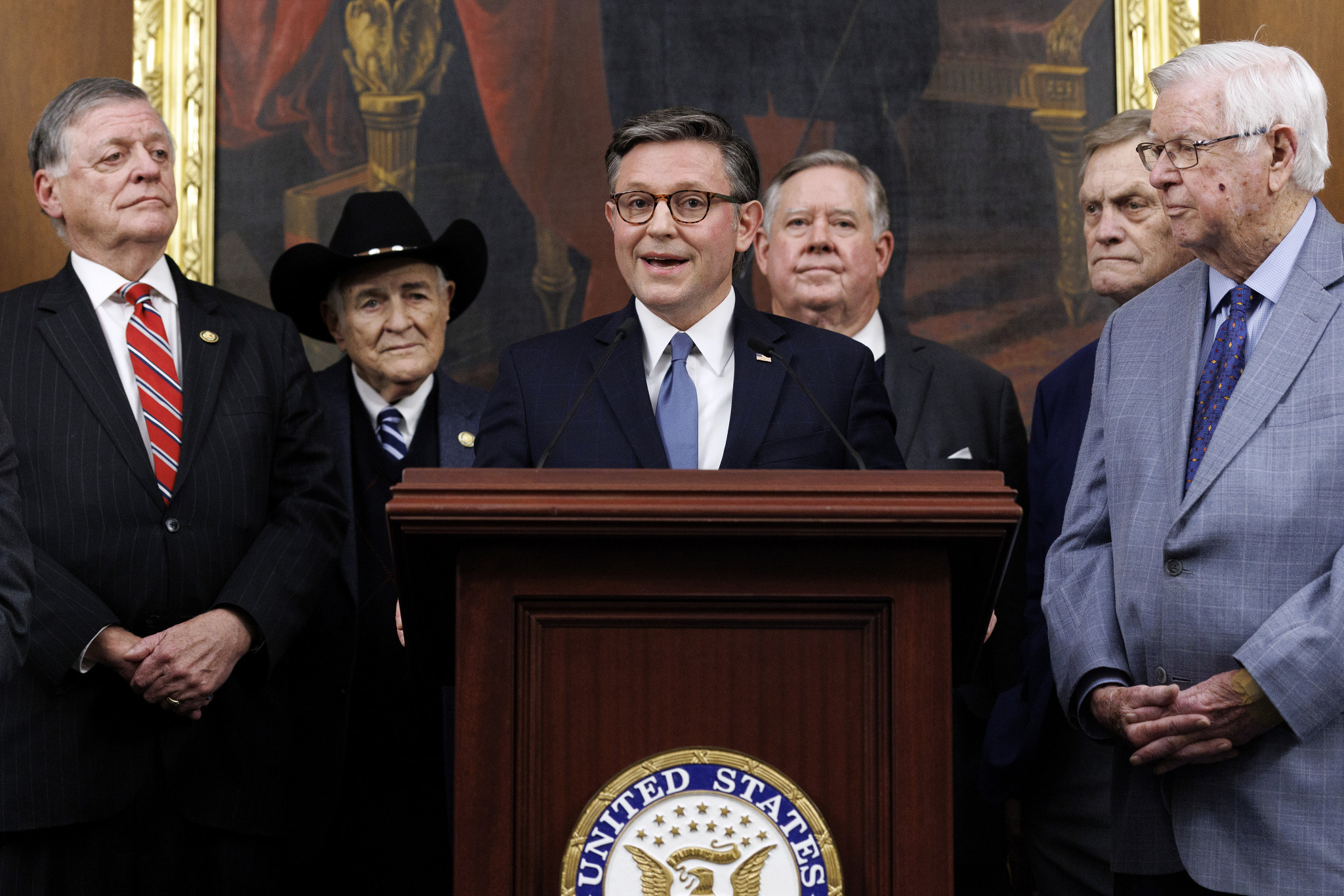 米下院は22日、国防総省や保健福祉、労働、教育などの各省に関する予算案を賛成多数で可決し、上院に送付した。政府機関の一部閉鎖回避に向け前進した。写真は、連邦議会議事堂で記者会見するジョンソン下院議長。【EPA時事】