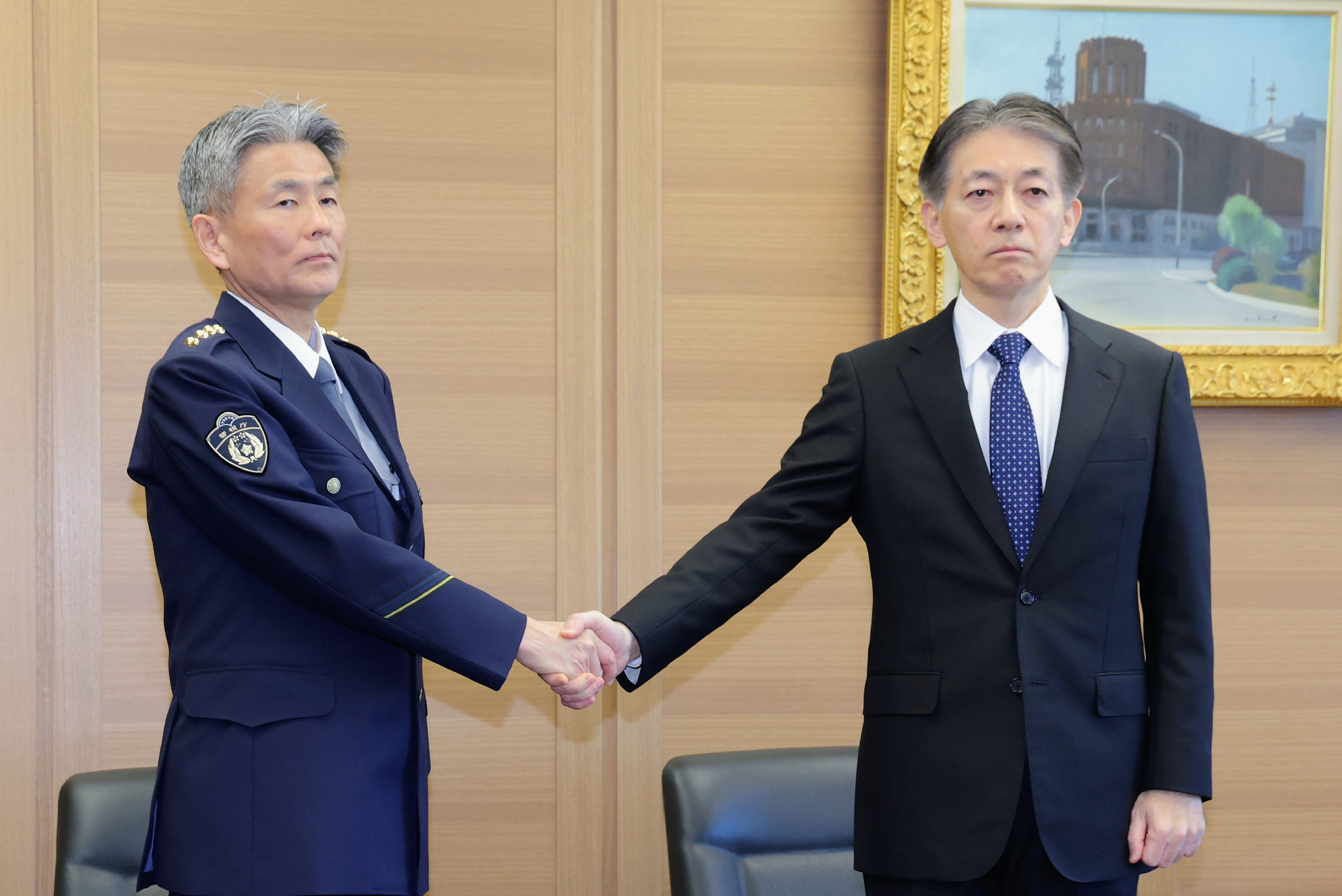 事務引き継ぎ後、握手する筒井洋樹警視総監(左)と迫田裕治前警視総監=23日午前、警視庁