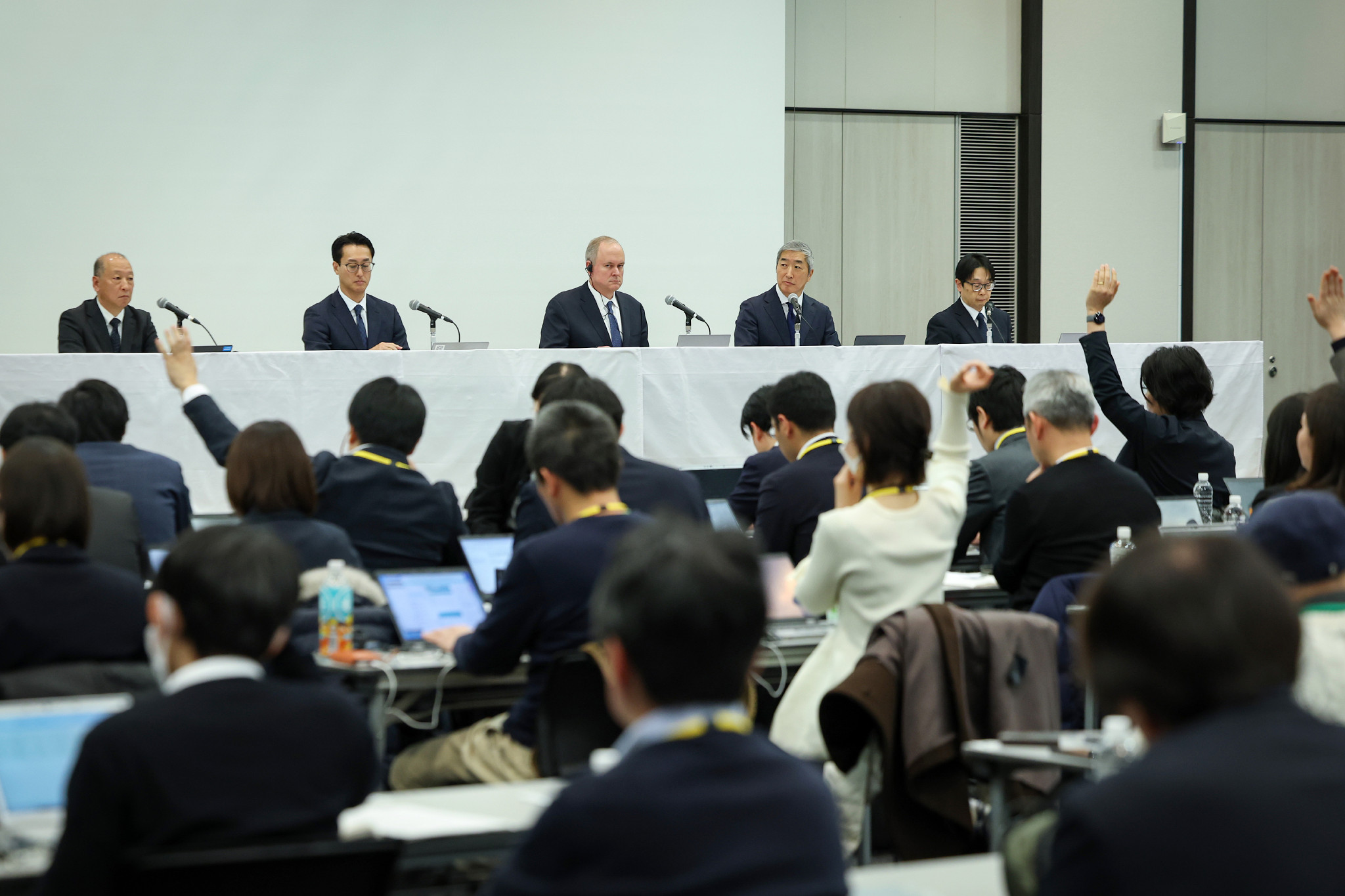 記者の質問を受けるプルデンシャル生命保険の間原寛社長(右から2人目)=23日午後、東京都港区