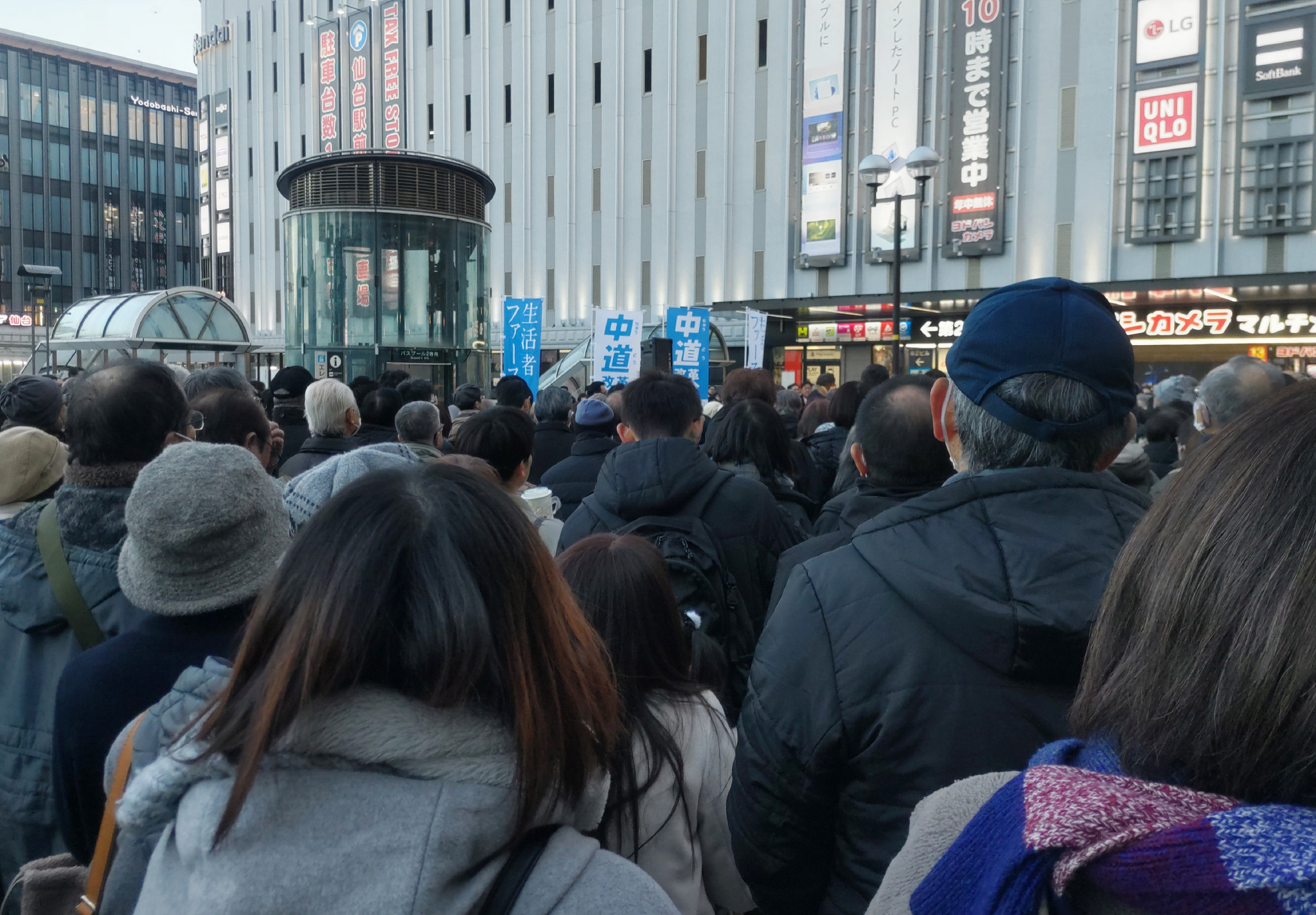 「中道改革連合」の立候補予定者の街頭演説を聴く人たち=24日午後、JR仙台駅前