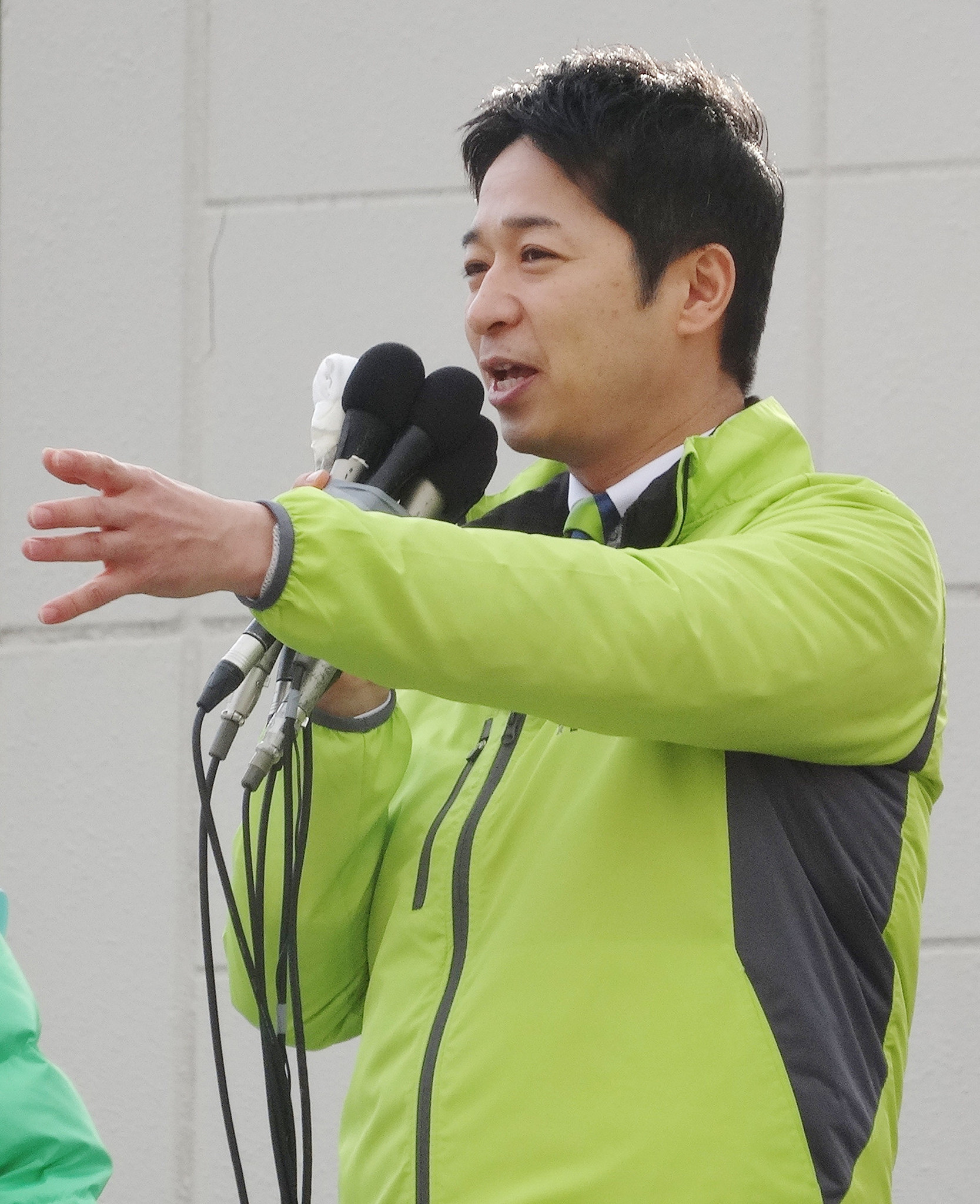 街頭演説する日本維新の会の藤田文武共同代表=24日午後、東京都江東区