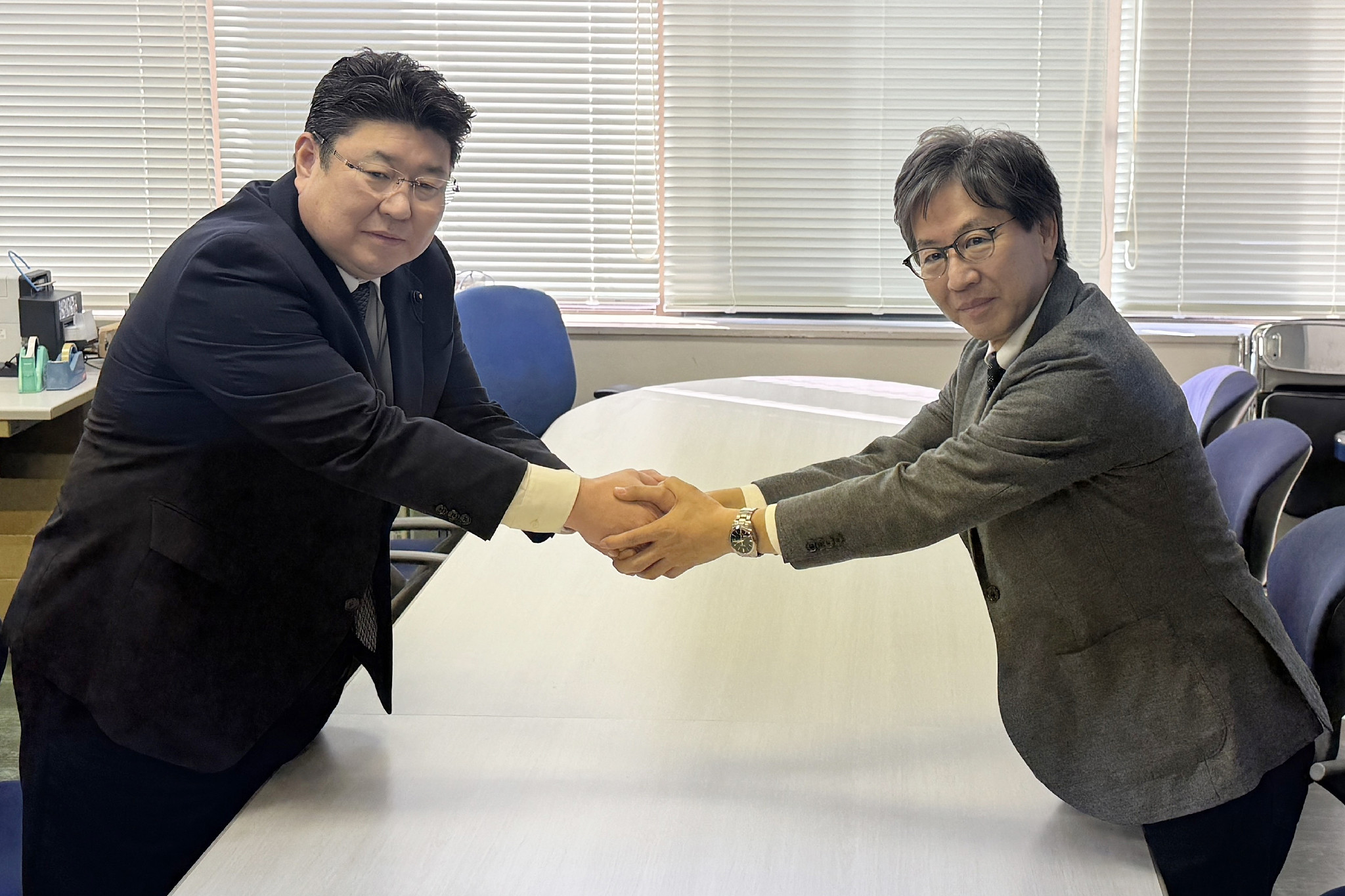 公明党の大分県本部を訪れ、幹部と握手する中道改革連合の安住淳共同幹事長(右)=25日午後、大分市