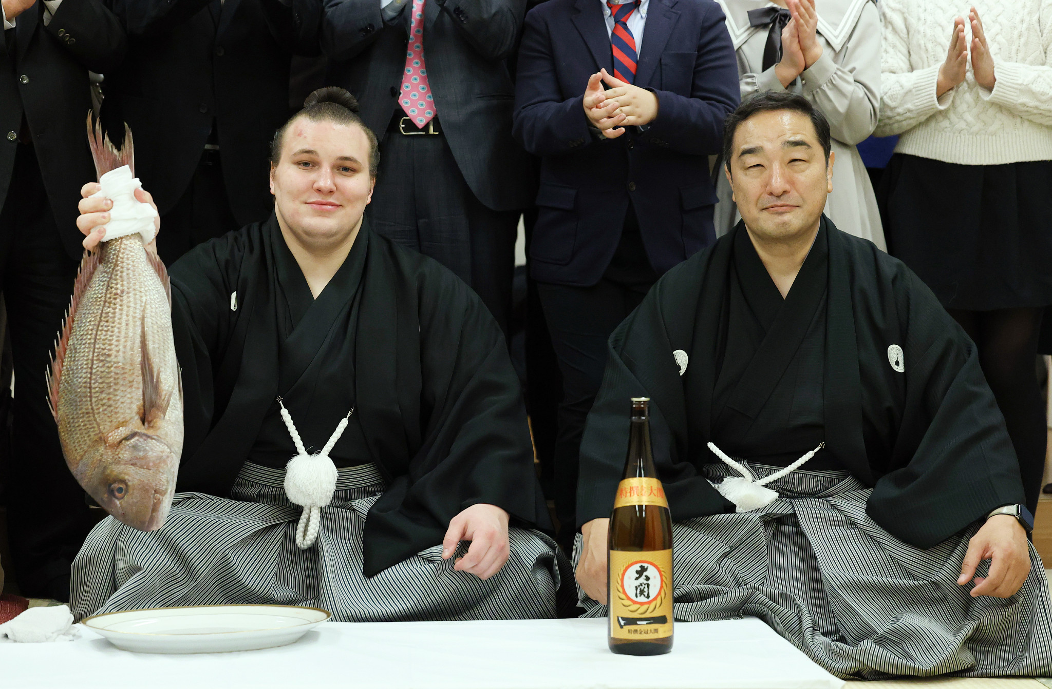 大相撲初場所千秋楽。大相撲初場所で優勝し、タイを手にする安青錦(左)。右は安治川親方=25日、東京都江東区
