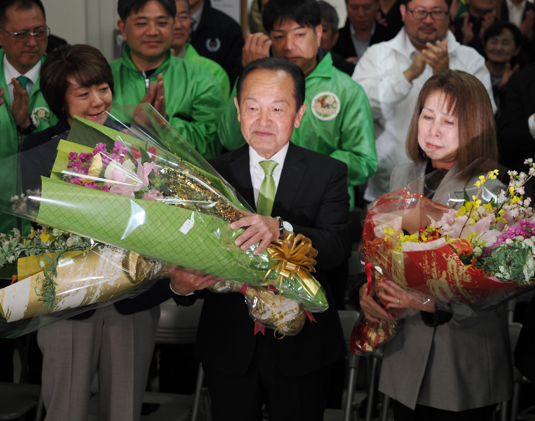 沖縄県名護市長選で3選を果たした渡具知武豊氏(中央)=25日、同市