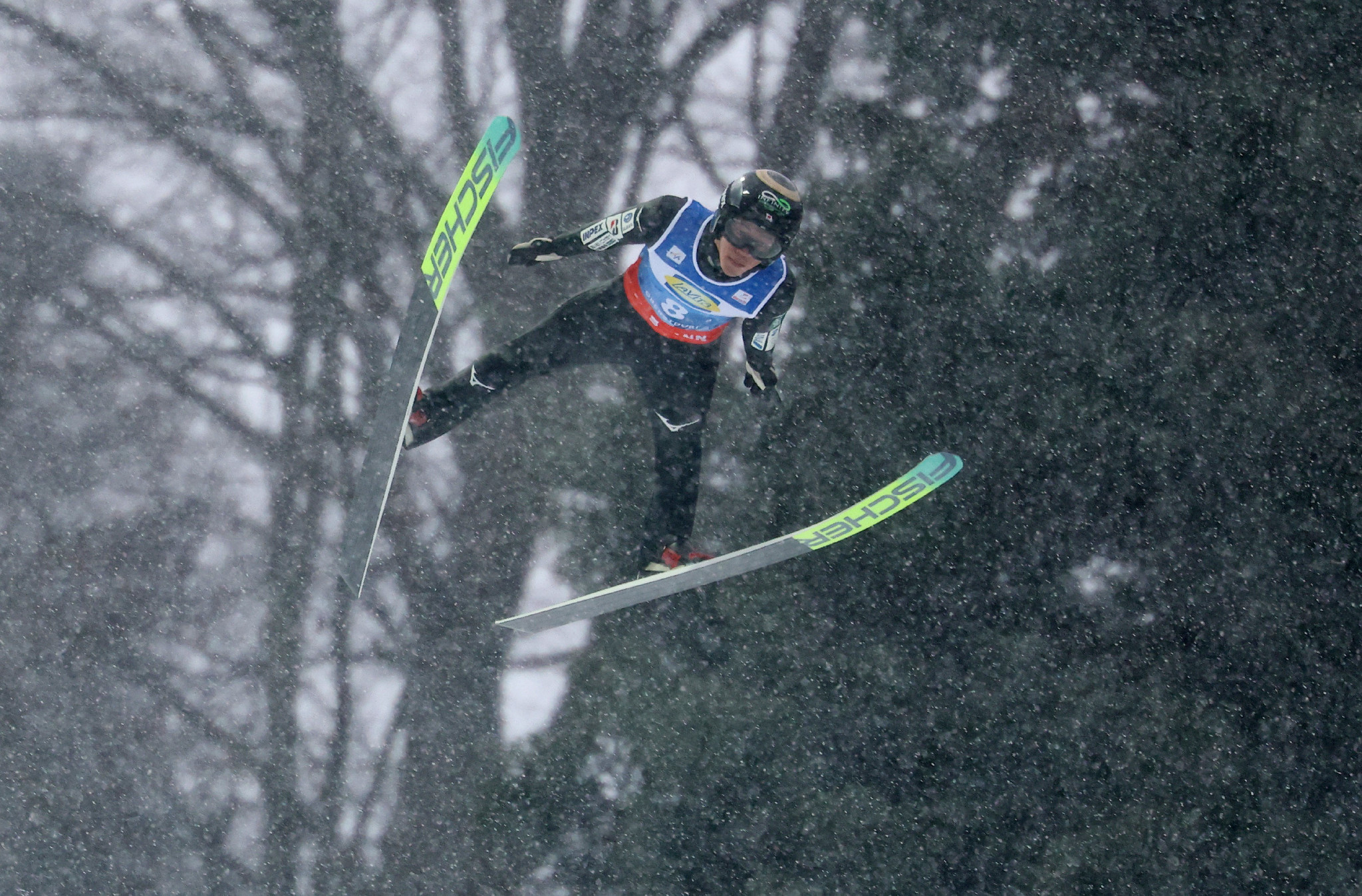 ノルディックスキー・ジャンプ男子のフライング世界選手権、団体で優勝した日本の二階堂蓮の飛躍=25日、ドイツ・オーベルストドルフ