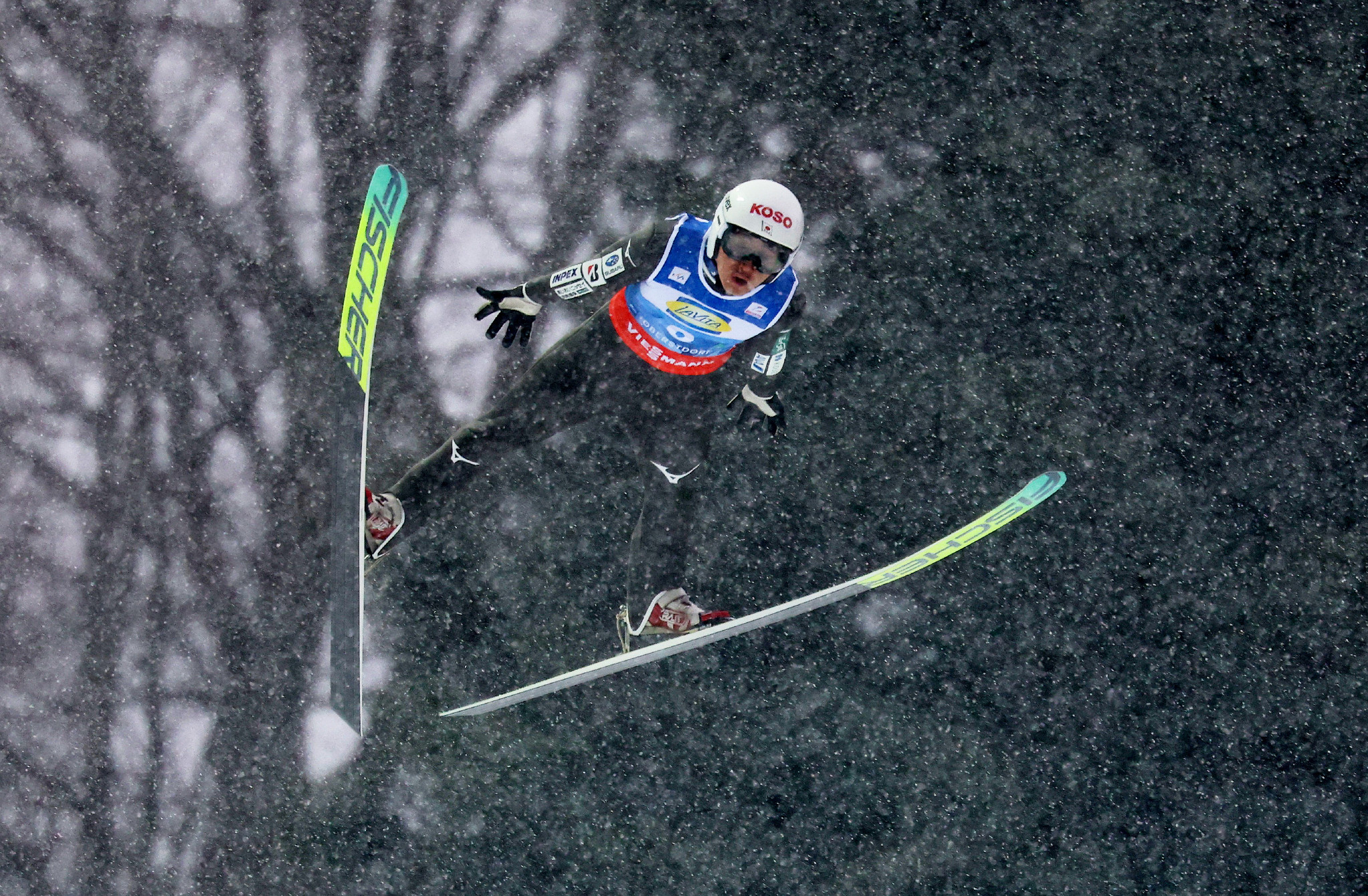 ノルディックスキー・ジャンプ男子のフライング世界選手権、団体で優勝した日本の内藤智文の飛躍=25日、ドイツ・オーベルストドルフ