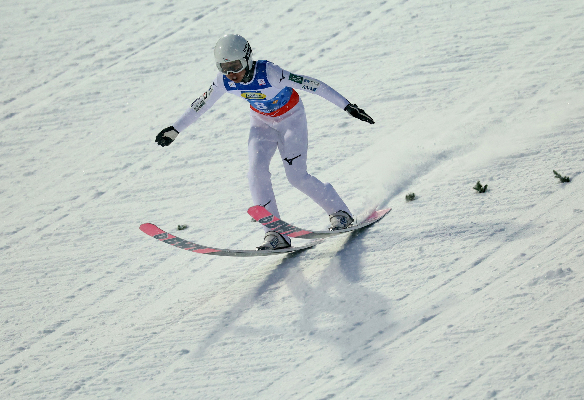 ノルディックスキー・ジャンプ男子のフライング世界選手権、団体で優勝した日本の中村直幹の着地=25日、ドイツ・オーベルストドルフ