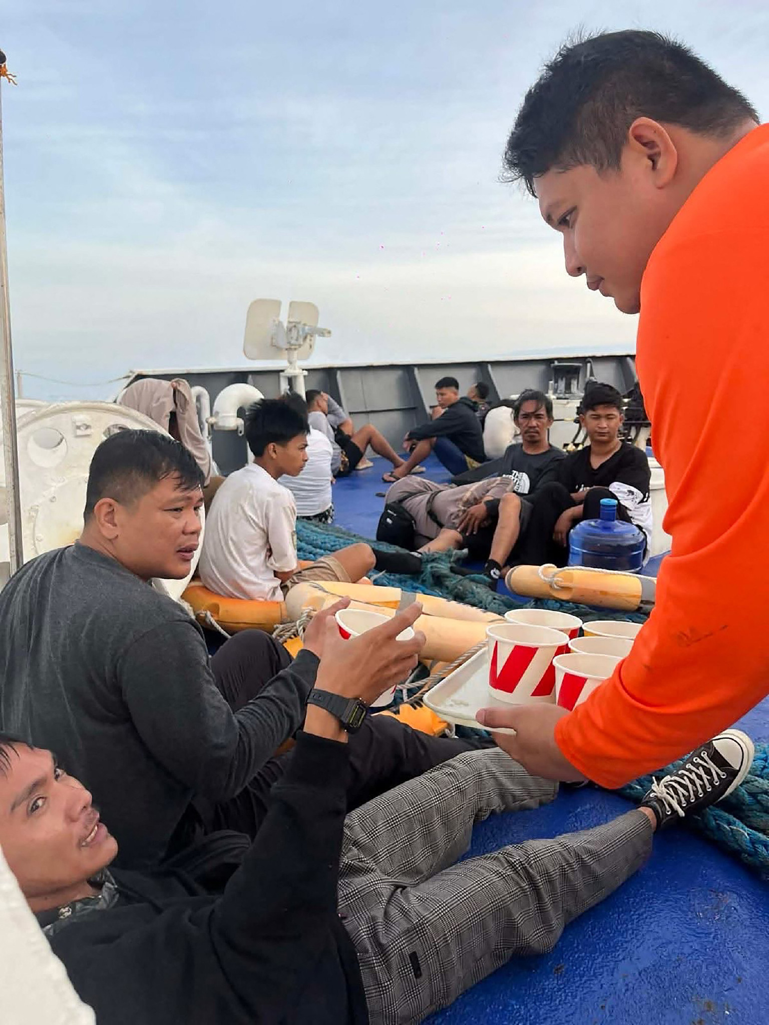 フィリピン南部沖で26日未明、340人超が乗ったフェリーが沈没し、少なくとも8人が死亡した。地元当局者が明らかにした。写真は救助された生存者ら(比沿岸警備隊提供)【AFP時事】