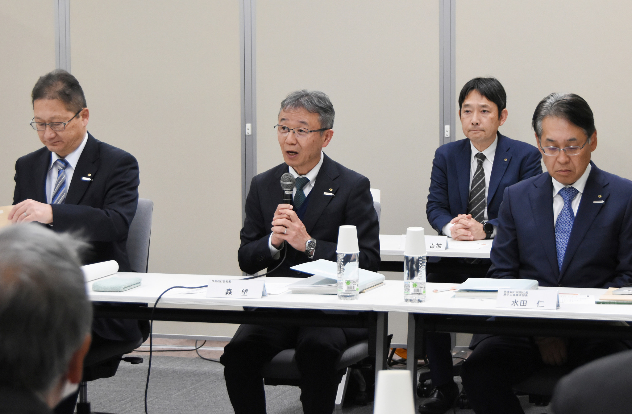 関西電力は27日、美浜原発が立地する福井県美浜町で、地元関係者と原発に関する懇談会を開いた。同町で原発新設に向けた調査を始めた昨年11月以降では初の開催。写真は、あいさつする森望社長(右から3人目)。
