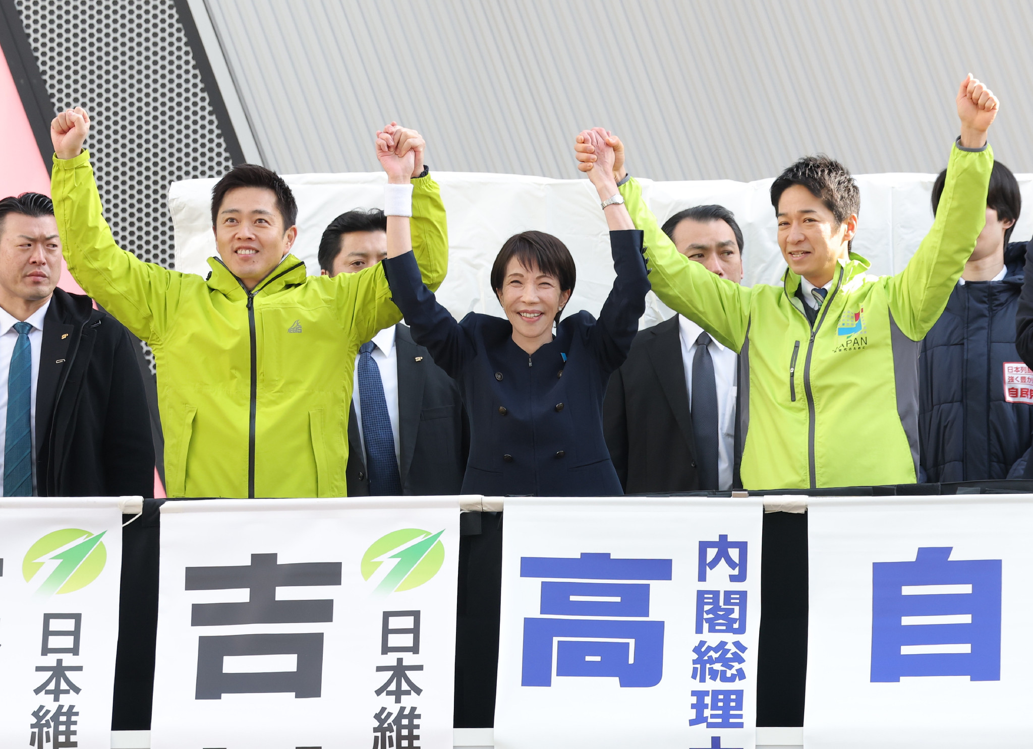 気勢を上げる高市氏と吉村代表ら