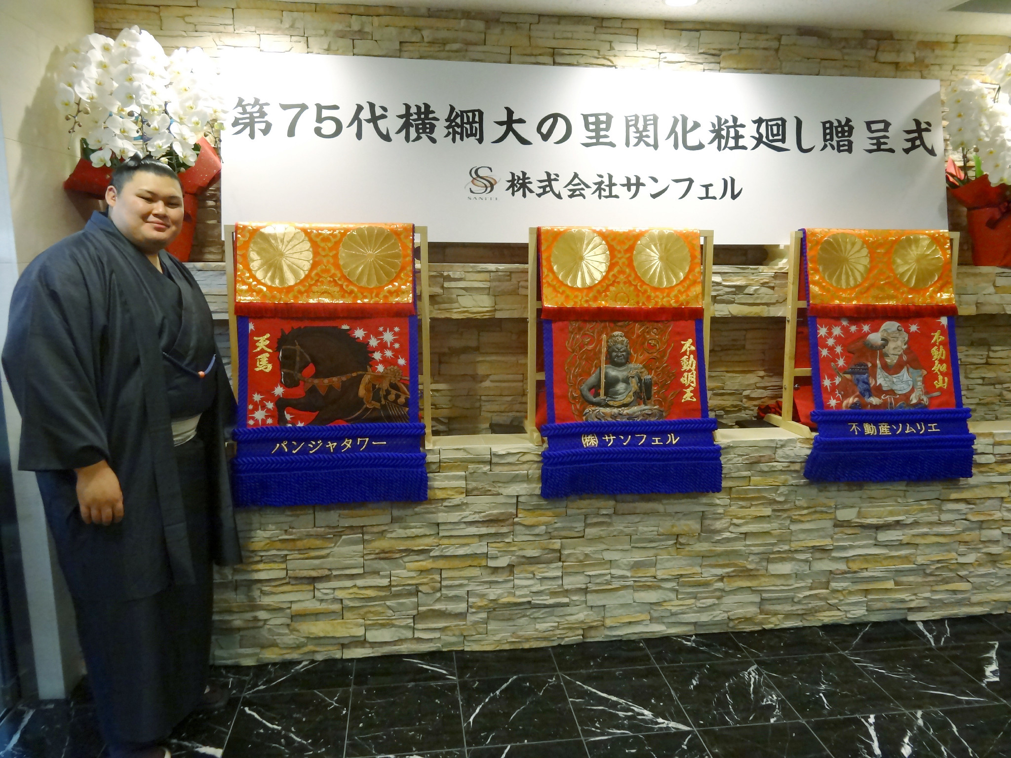 大相撲の大の里が28日、東京都中央区での化粧まわしの贈呈式に出席した。横綱の東京後援会長を務める深沢朝房さんが、不動明王、天馬、不動如山という文字が入った三つぞろいの化粧まわしを贈った。