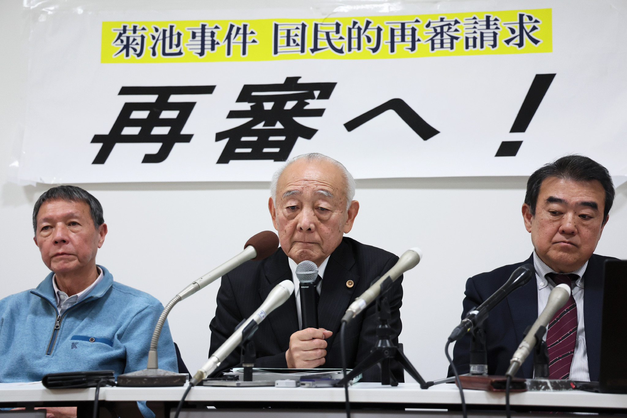 「菊池事件」の再審請求棄却決定を受け、記者会見で厳しい表情を見せる徳田靖之弁護士(中央)ら=28日午後、熊本市中央区