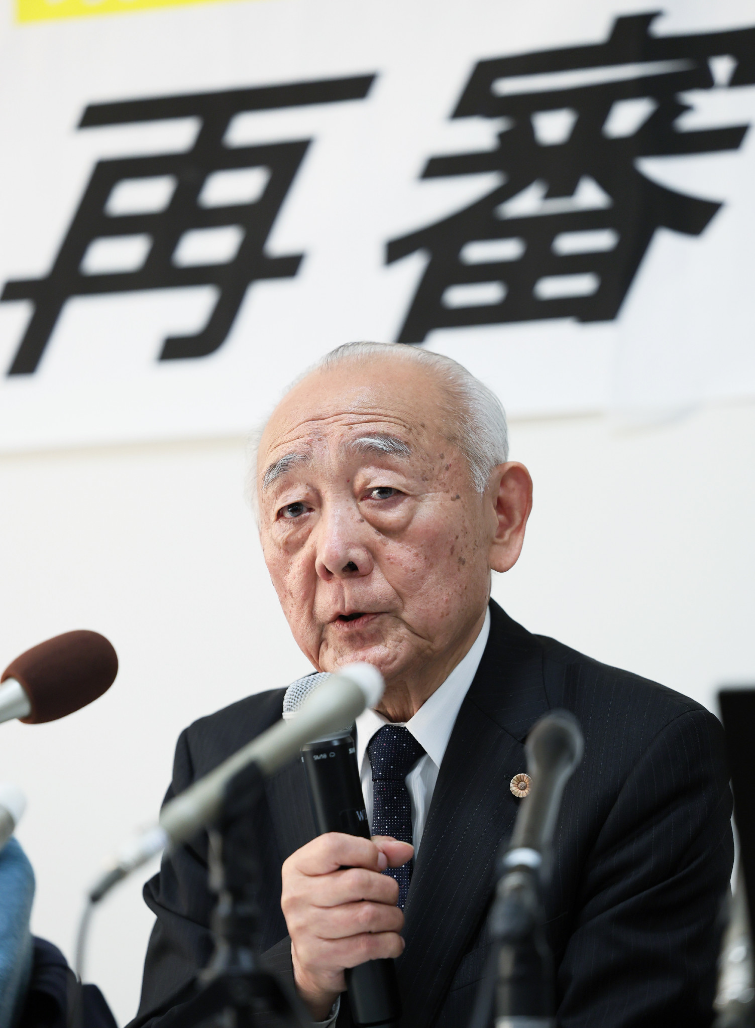 「菊池事件」の再審請求棄却決定を受け、記者会見する徳田靖之弁護士=28日午後、熊本市中央区