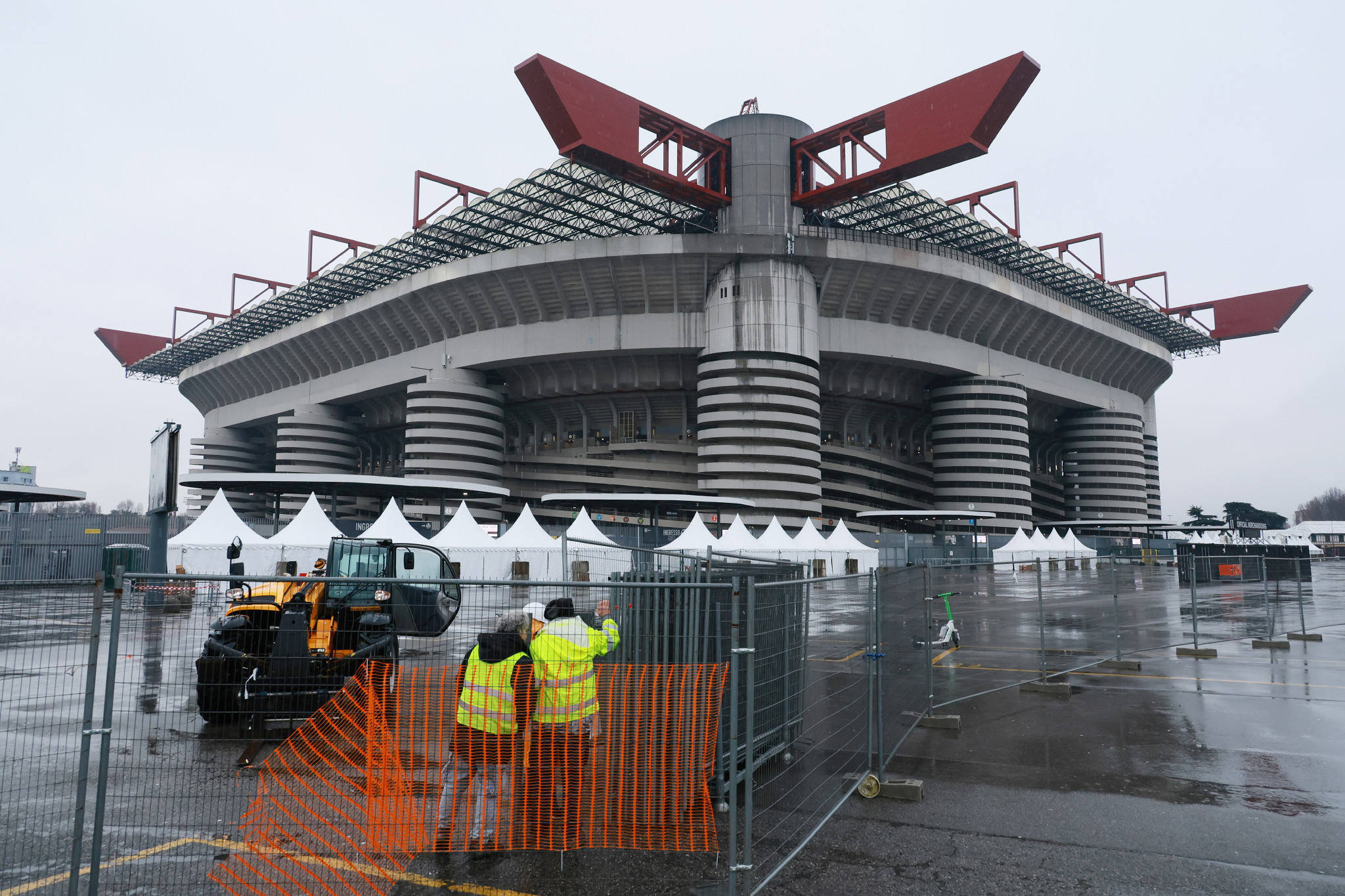 ミラノ・コルティナ冬季五輪の開幕まで、30日であと1週間。写真は、柵が設置された開会式が行われるサンシーロ五輪競技場=28日、ミラノ